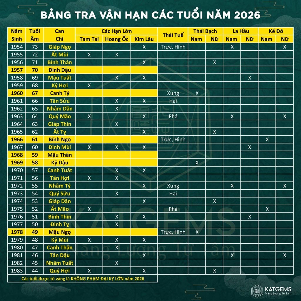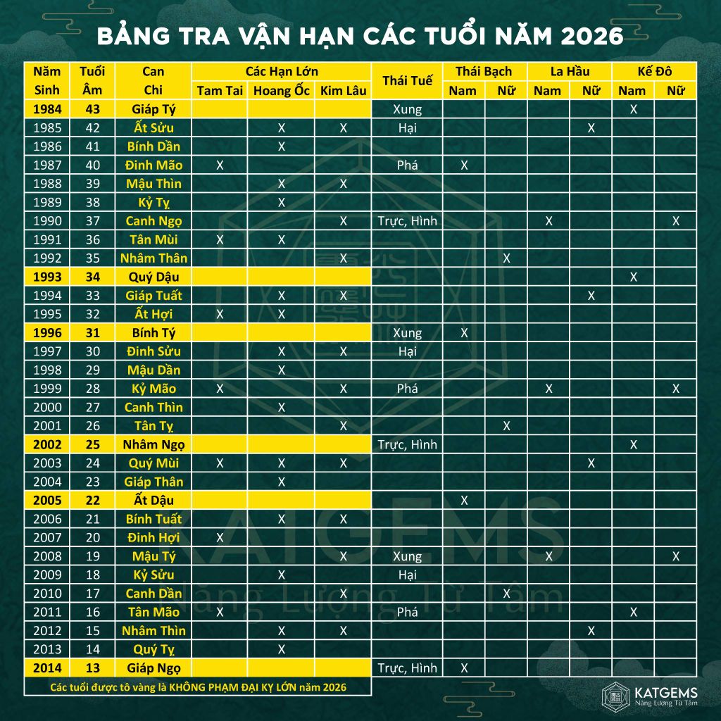 Bảng Tra Vận Hạn Các Tuổi Năm 2026 giúp phân tích chi tiết các yếu tố hạn lớn như Tam Tai, Hoang Ốc, Kim Lâu, và các hạn nhỏ như Thái Tuế, Thái Bạch, La Hầu, Kế Đô và các sao khác. Việc tra cứu bảng này cho phép Gia Chủ nắm rõ những hạn chế và rủi ro có thể gặp phải trong năm 2026.