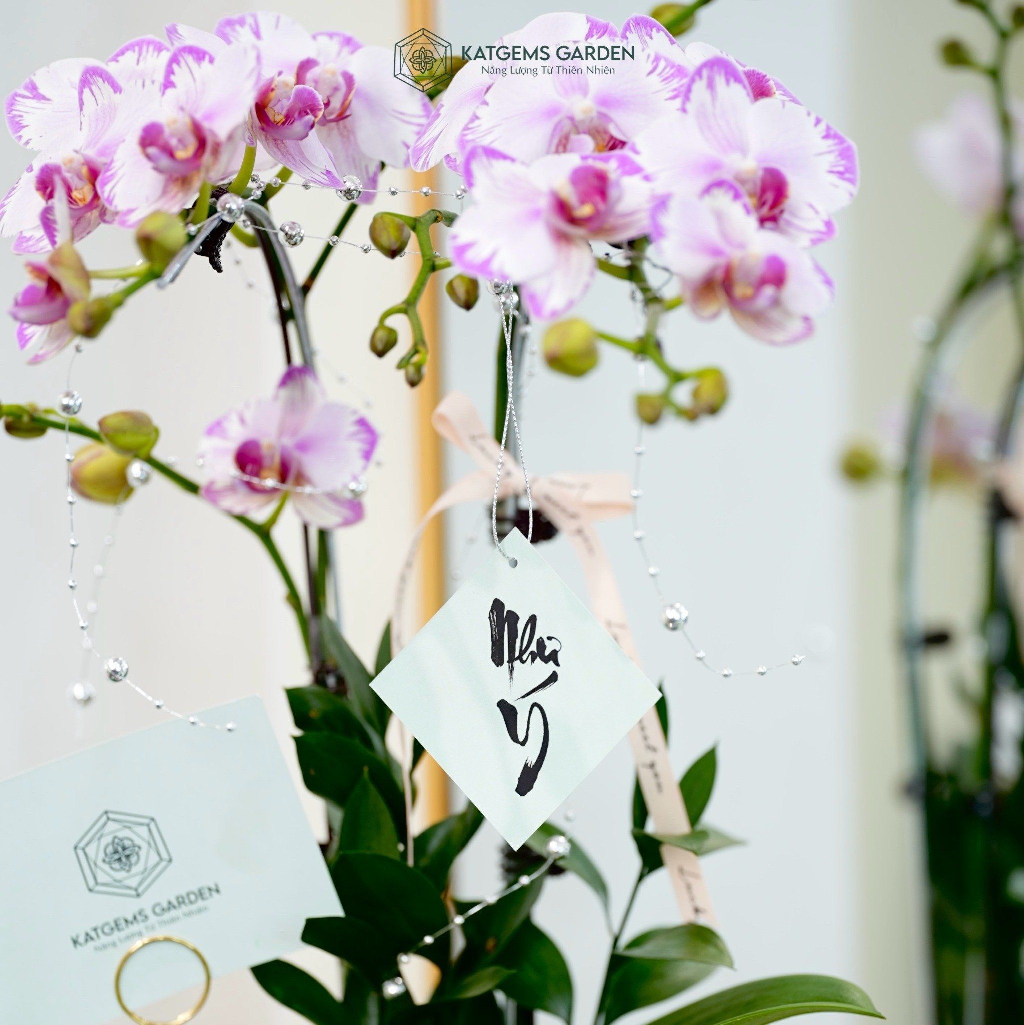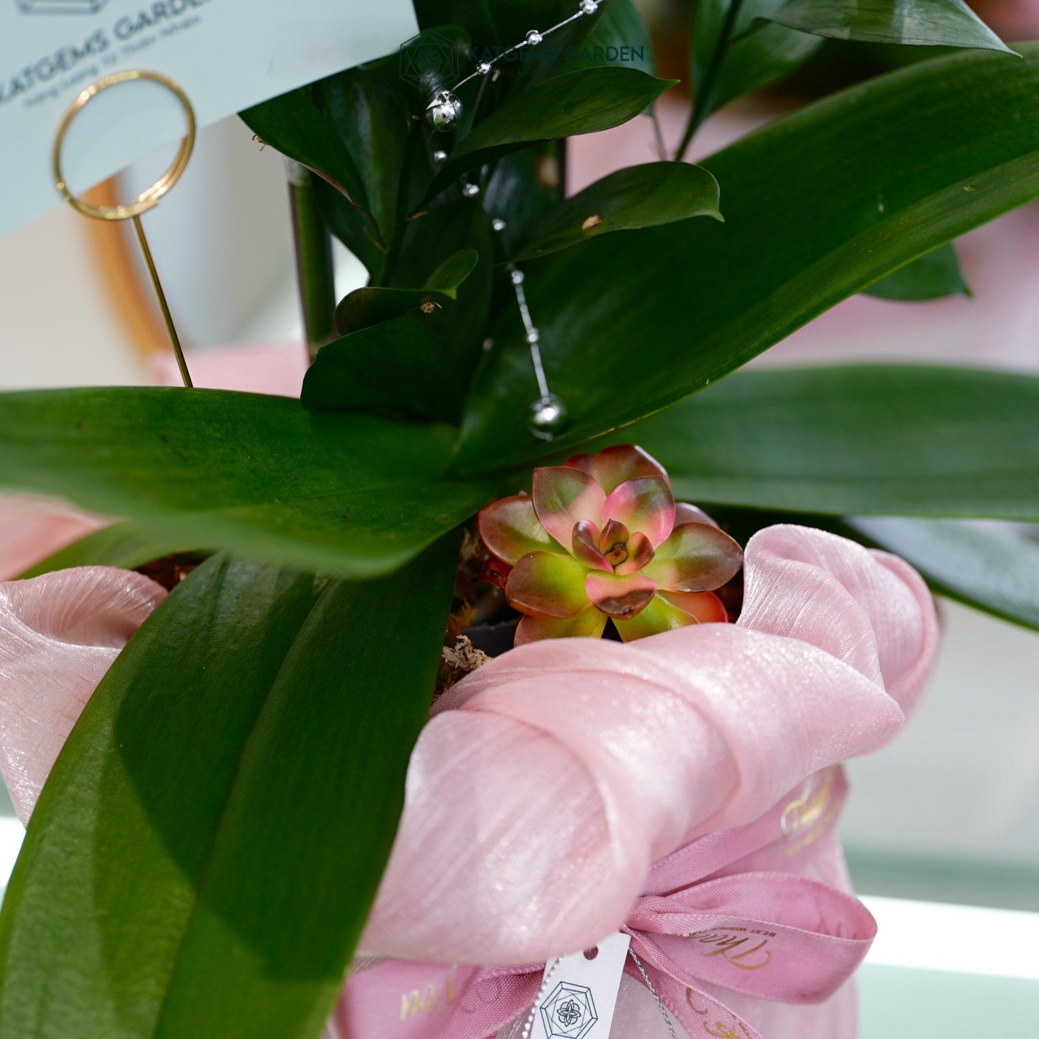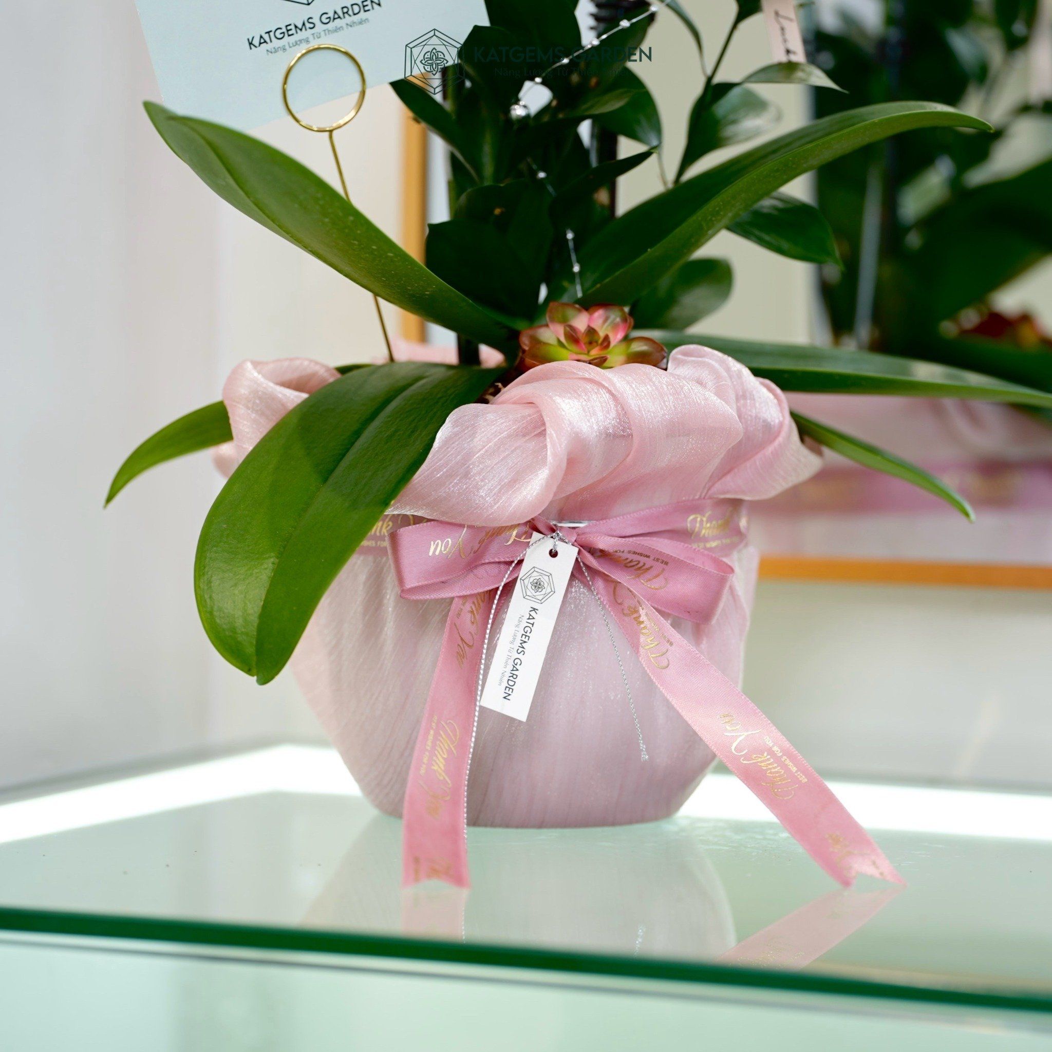 An Nhiên Hồ Điệp Lan Mini Chớp Hồng Sen Đá Chậu Bọc Voan Hồng Nhạt 50cm x 13cm