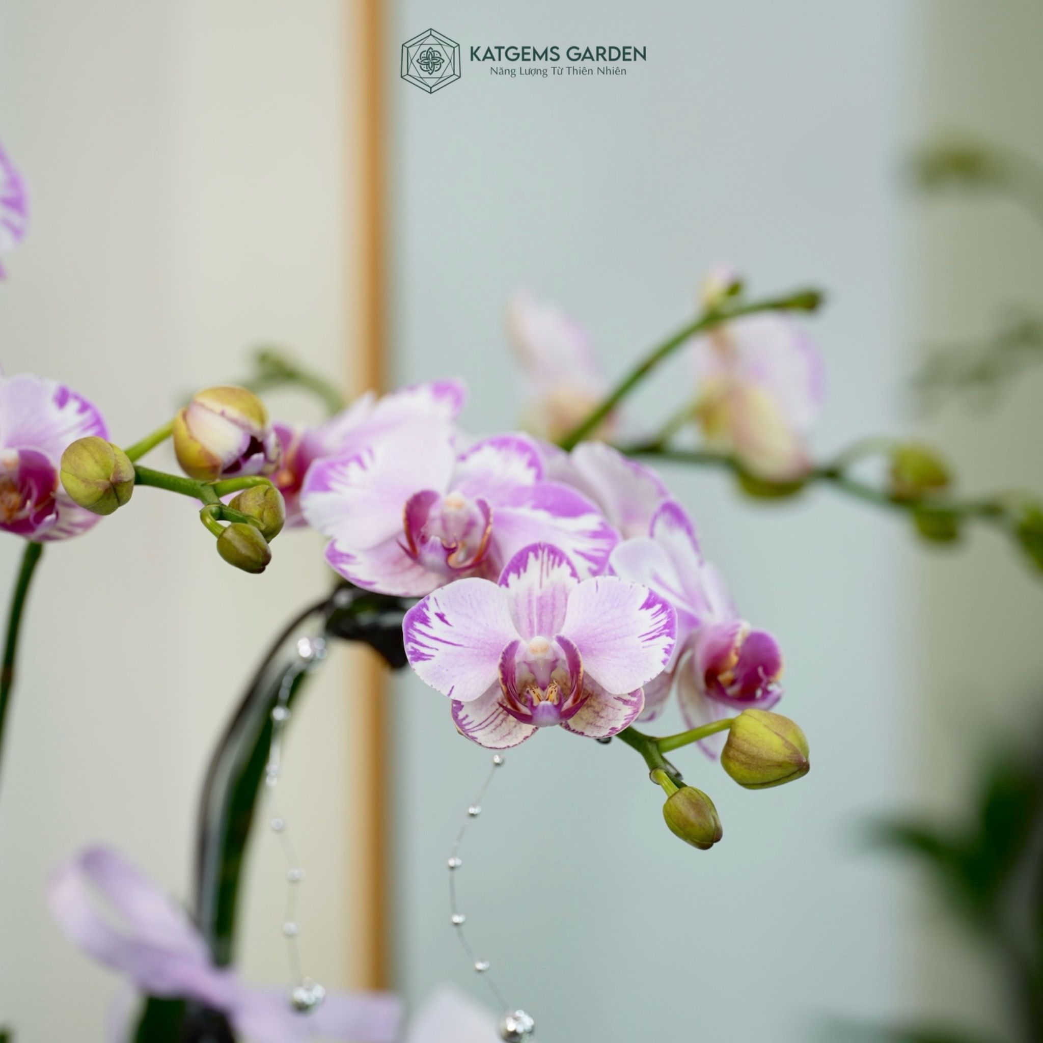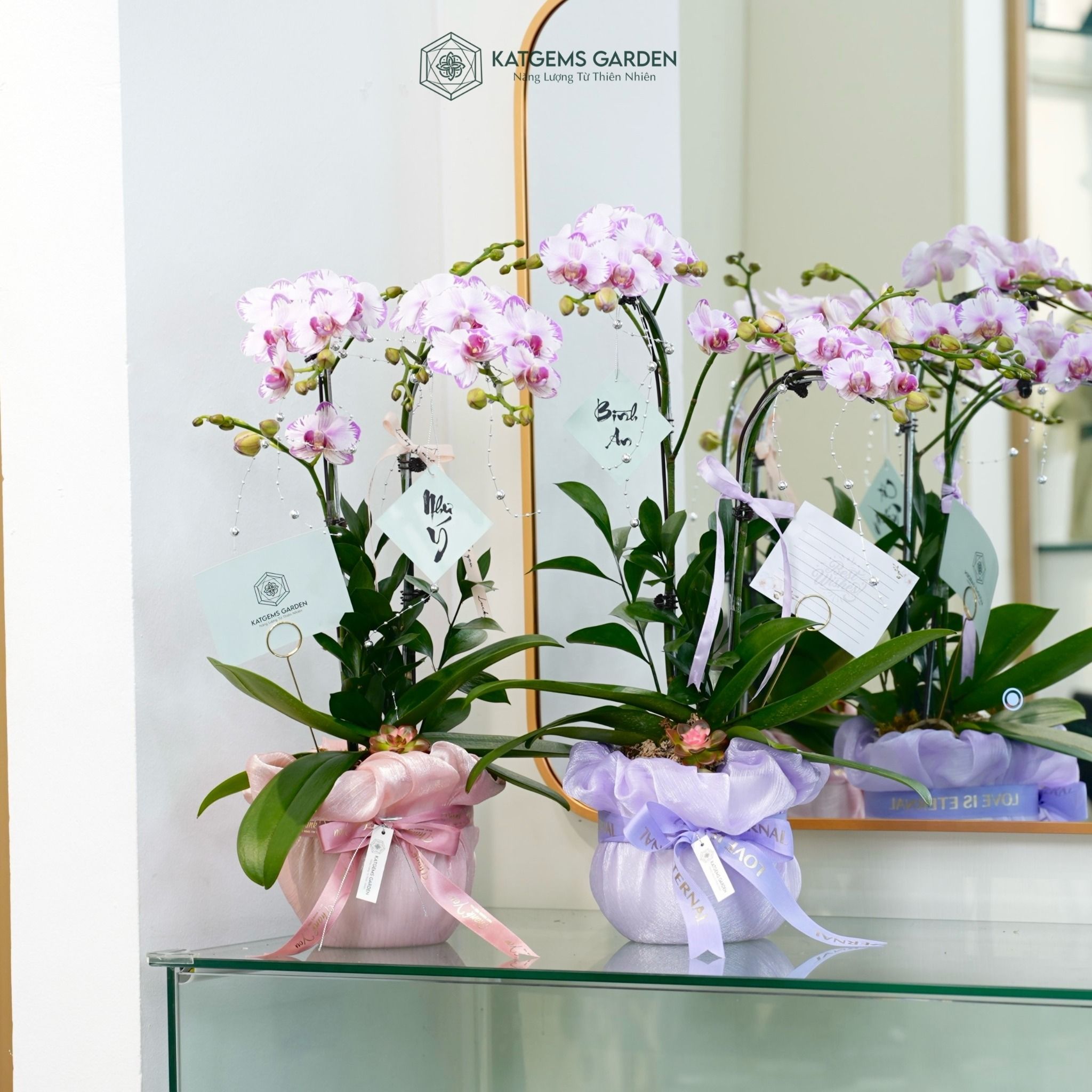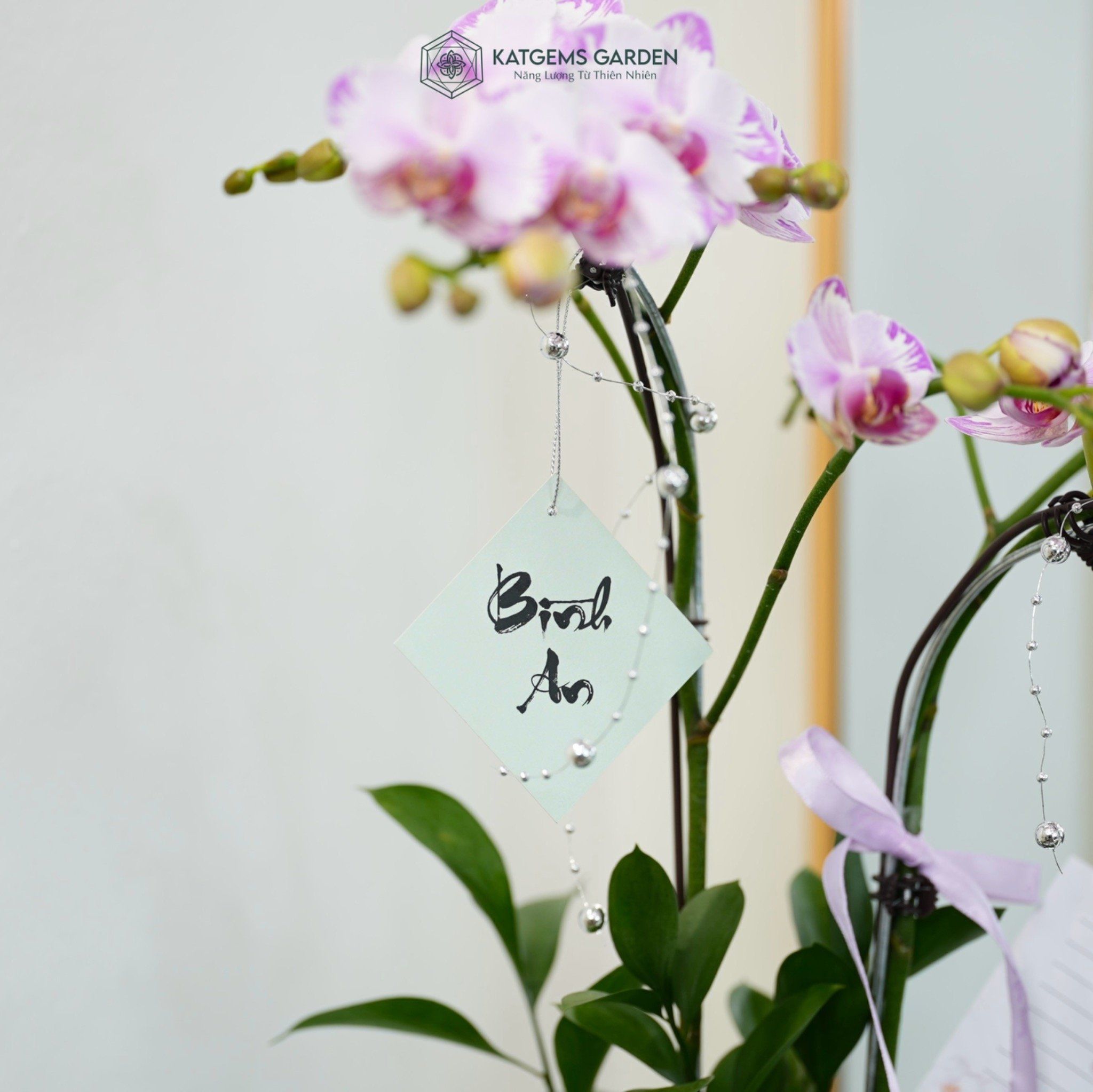 An Nhiên Hồ Điệp Lan Mini Chớp Hồng Sen Đá Chậu Bọc Voan Tím Phớt 50cm x 13cm