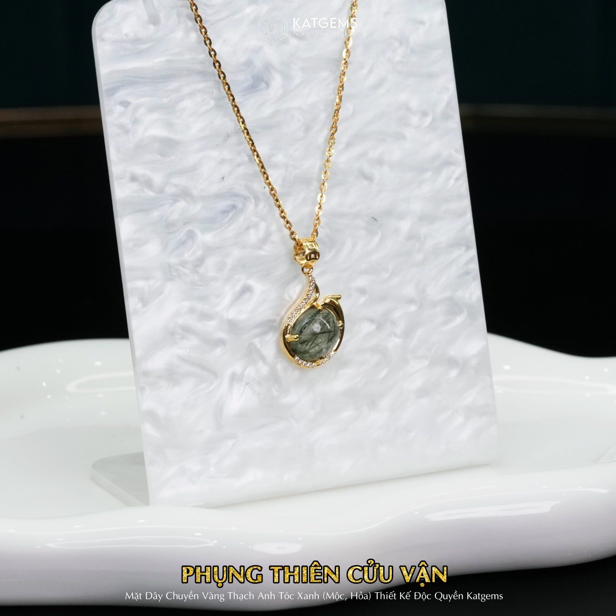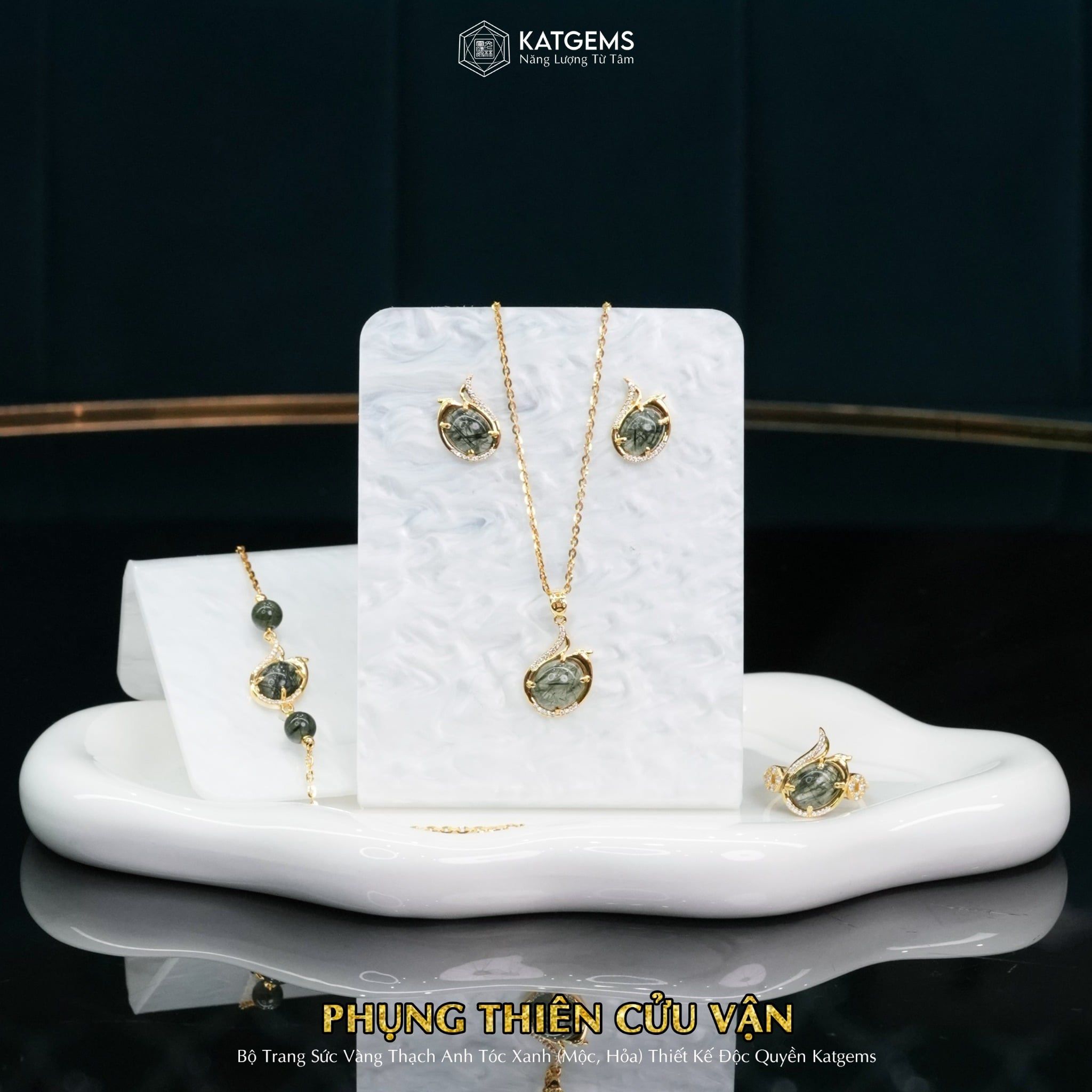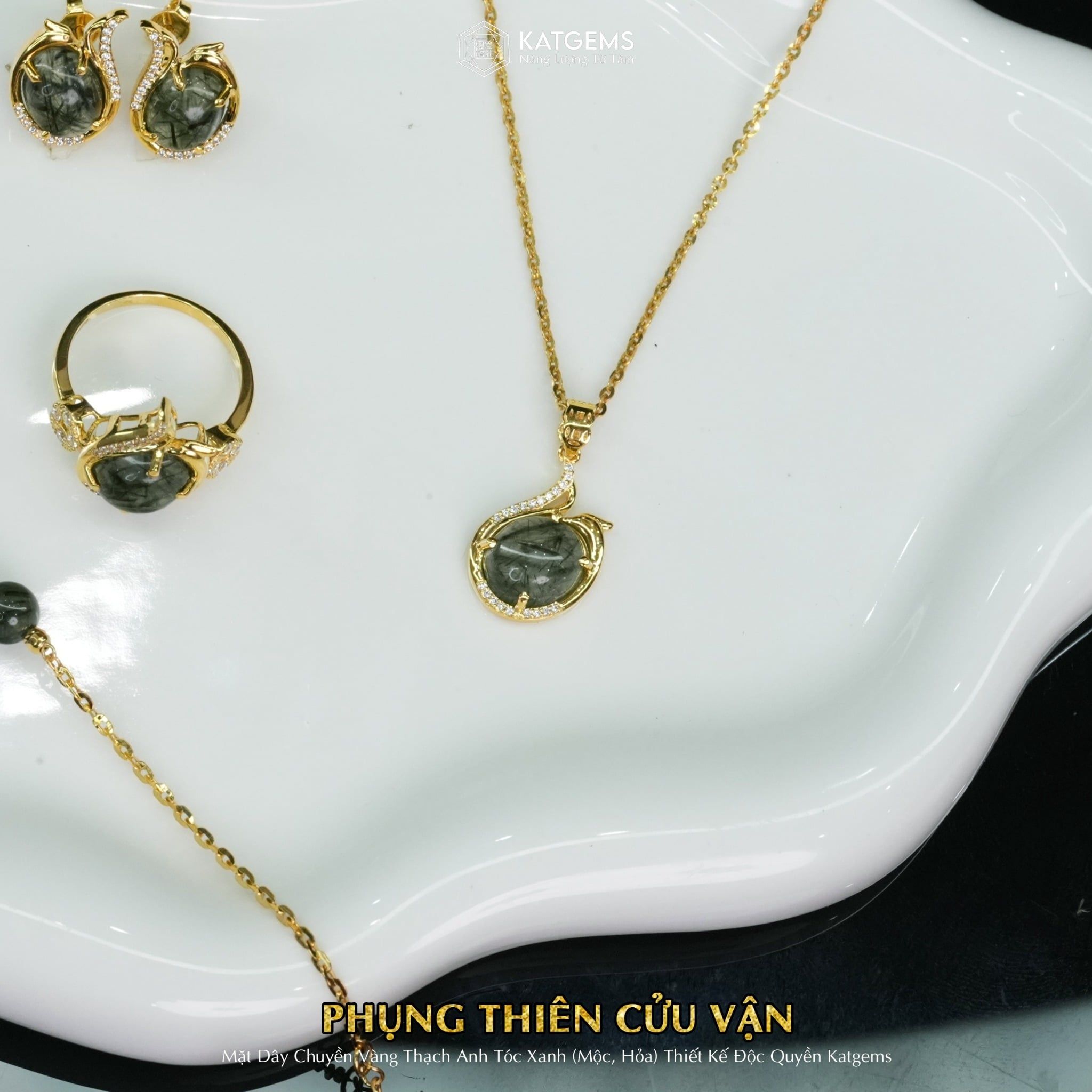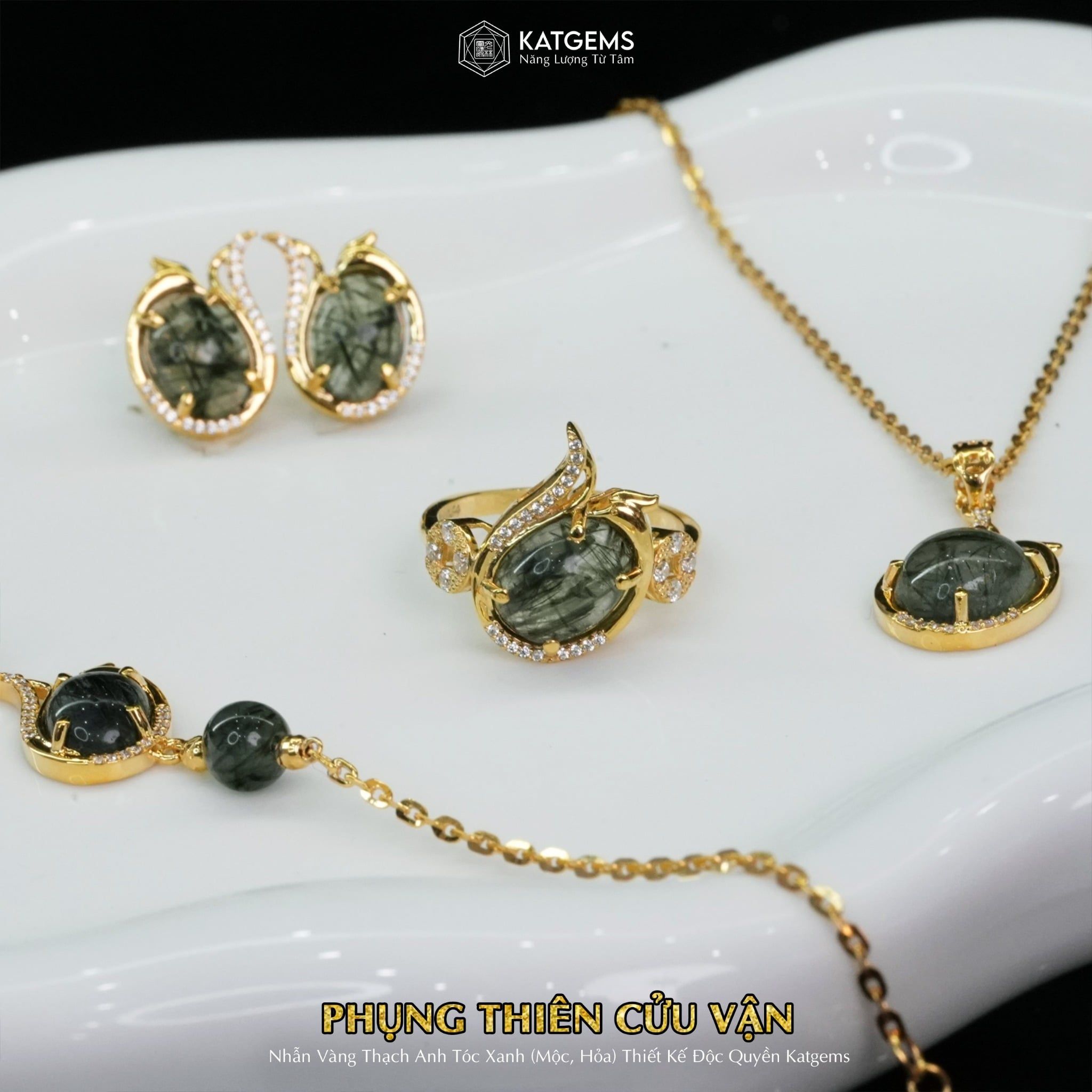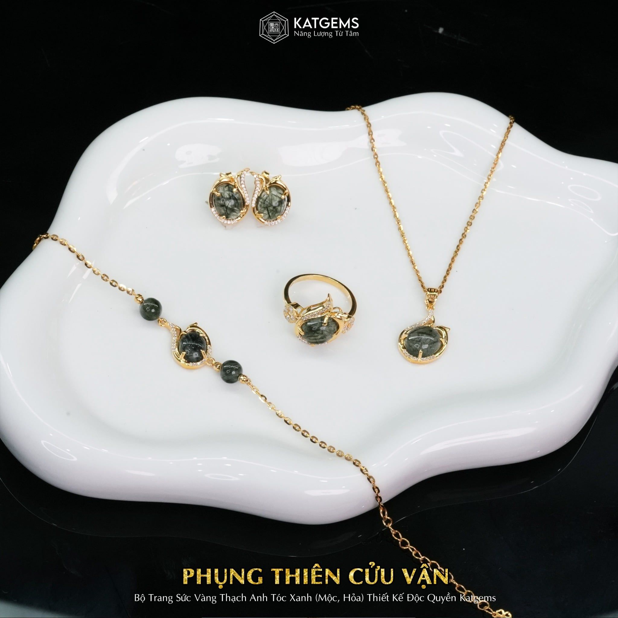 Bộ Trang Sức Vàng Phụng Thiên Cửu Vận Thạch Anh Tóc Xanh (Hỏa, Mộc) Độc Quyền Katgems