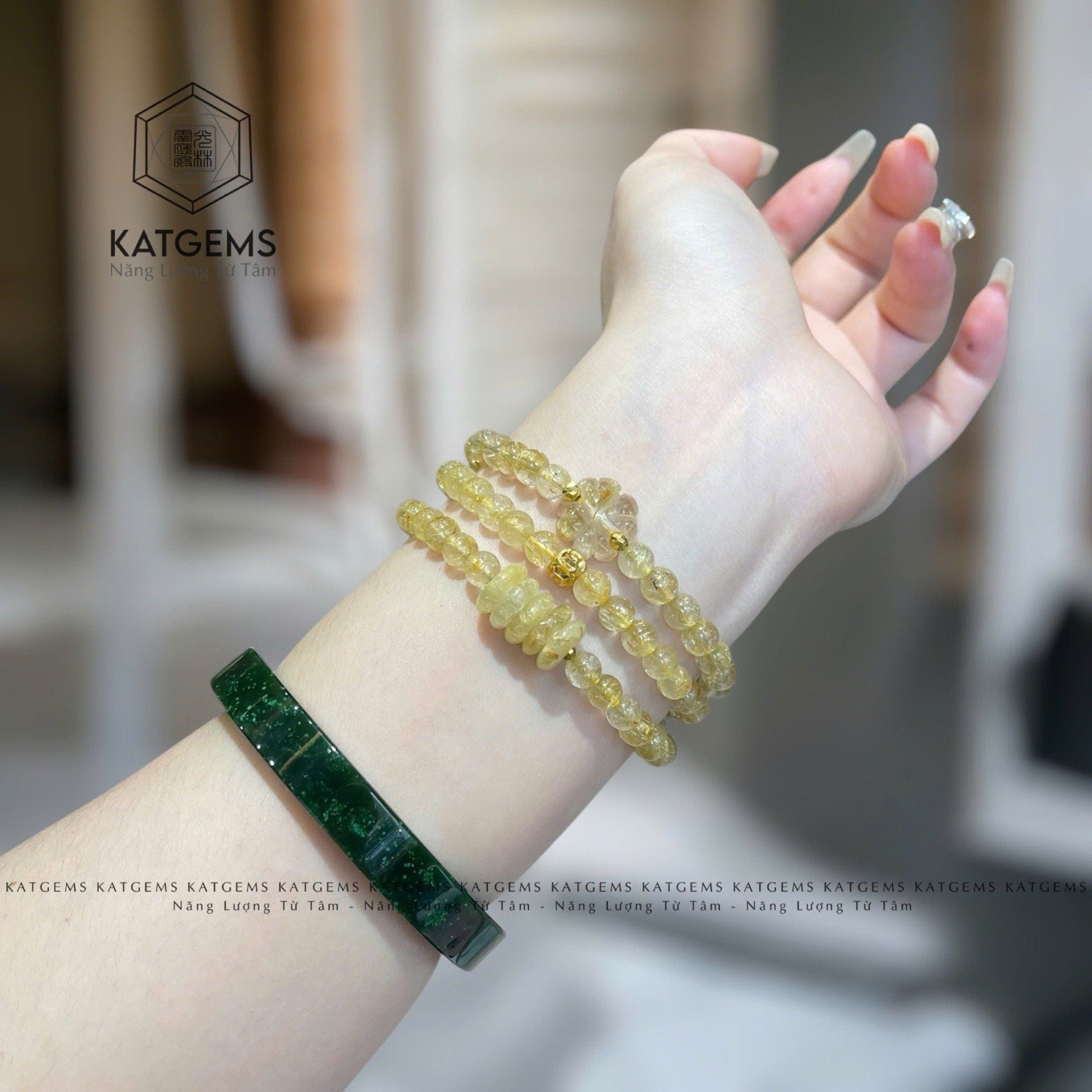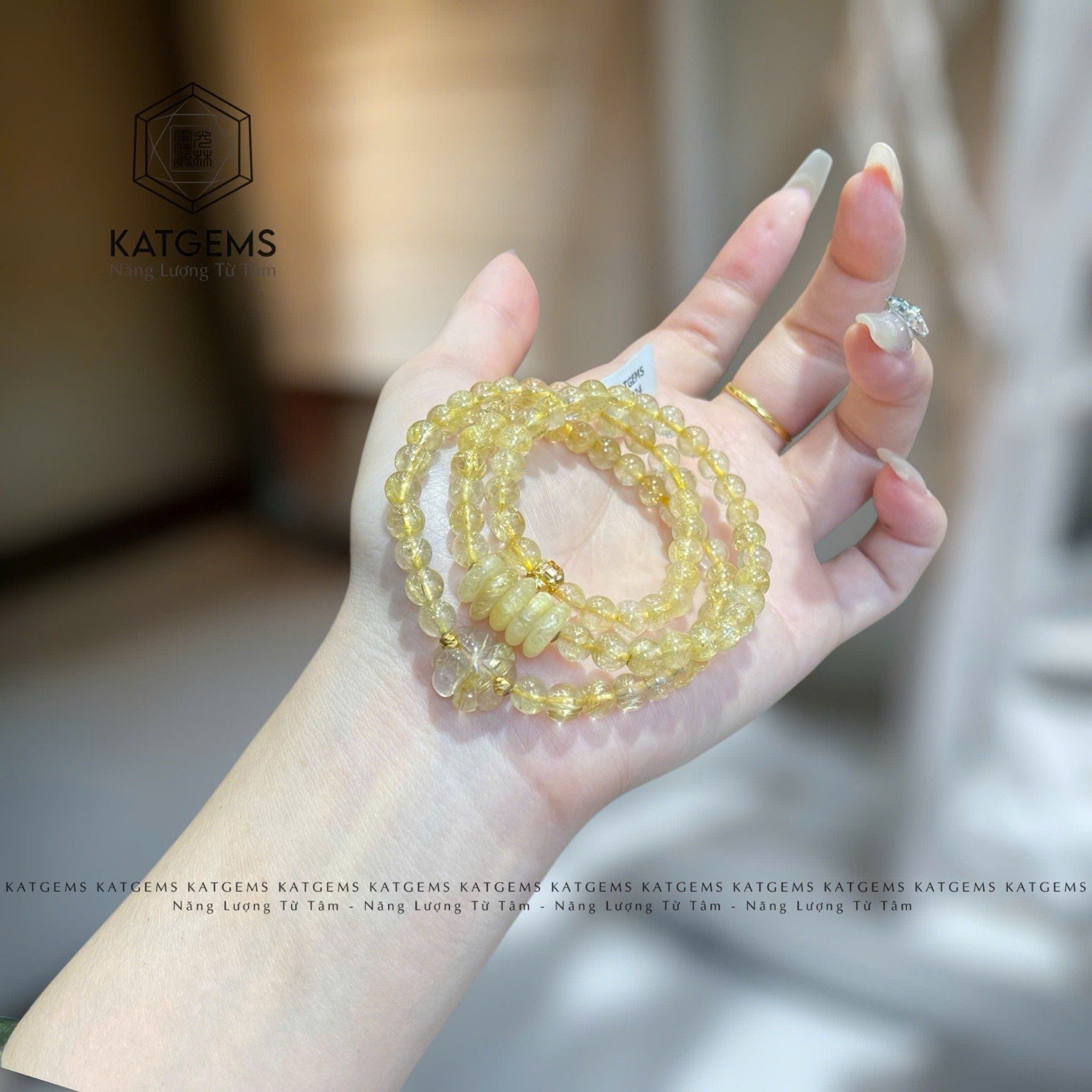 Chuỗi Vòng Đá Thạch Anh Tóc Vàng Trong 5.6ly Mix Cỏ Bốn Lá, Ngũ Điếu Và Bi Vàng Trang Sức (Kim, Thổ) 2-122002