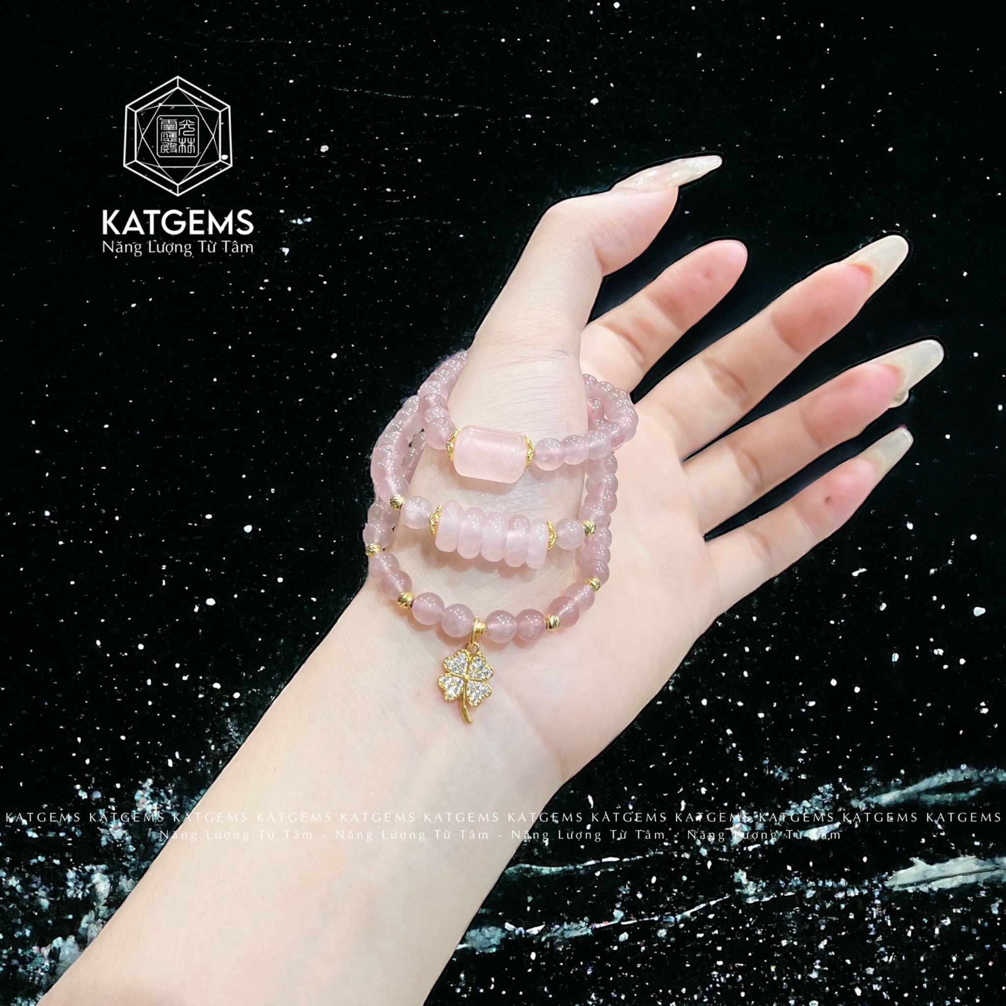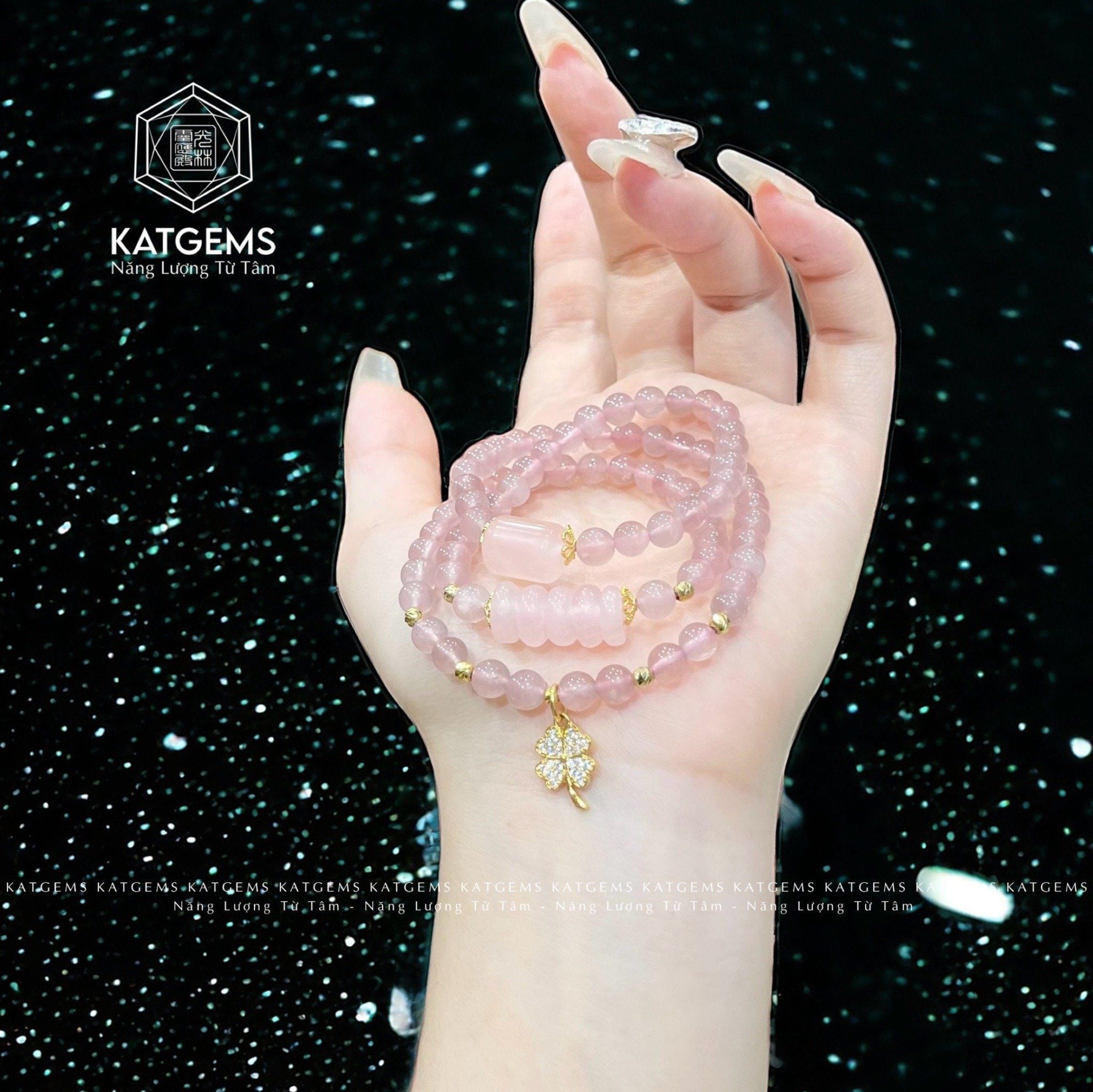 Chuỗi Vòng Thạch Anh Hồng 5.5ly Lu Thống Mix Ngũ Điếu Và Charm Cỏ Bốn Lá Vàng Trang Sức (Hỏa, Thổ) 1-125005