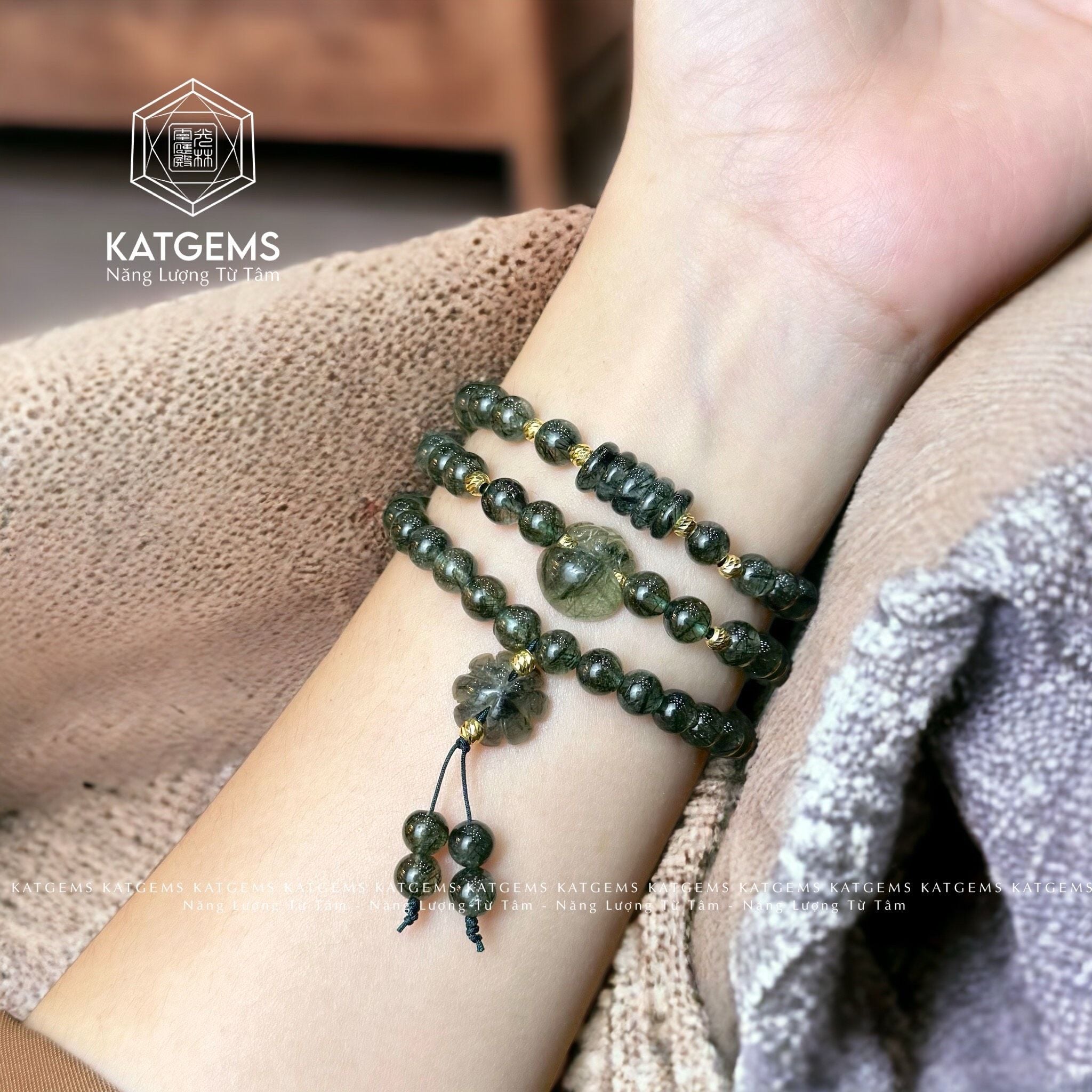 Chuỗi Vòng Thạch Anh Tóc Xanh 6ly Túi Tiền Kim Bảo Mix Cỏ Bốn Lá, Ngũ Điếu Và Bi Vàng Trang Sức (Mộc, Hỏa) 1-124004