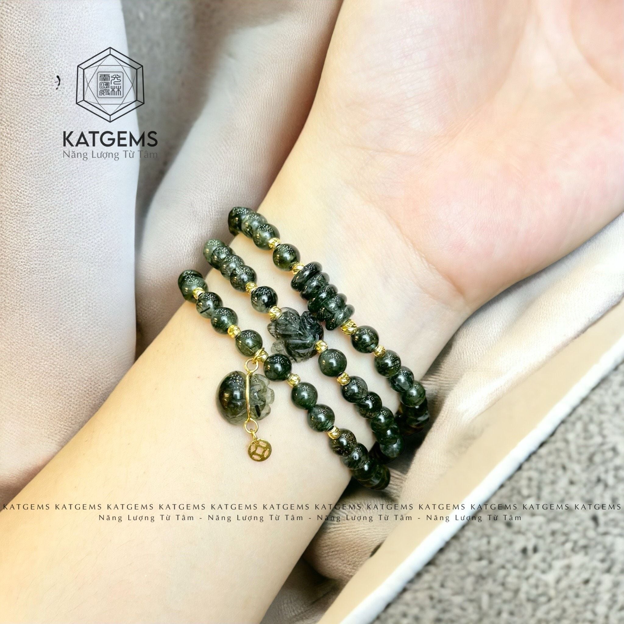 Chuỗi Vòng Thạch Anh Tóc Xanh 6ly Túi Tiền Kim Bảo Mix Hồ Ly, Ngũ Điếu Và Charm Vàng Trang Sức (Mộc, Hỏa) 1-124004
