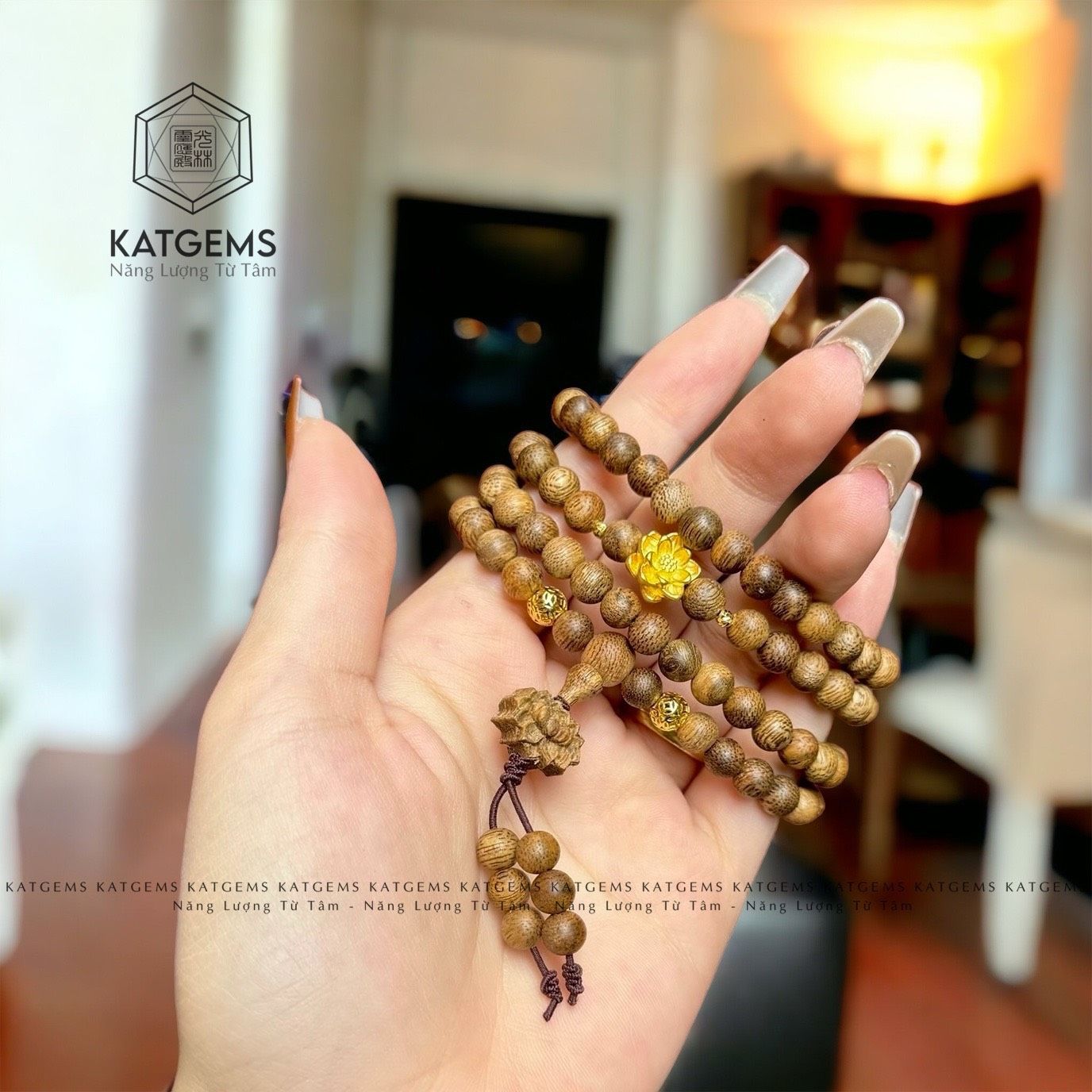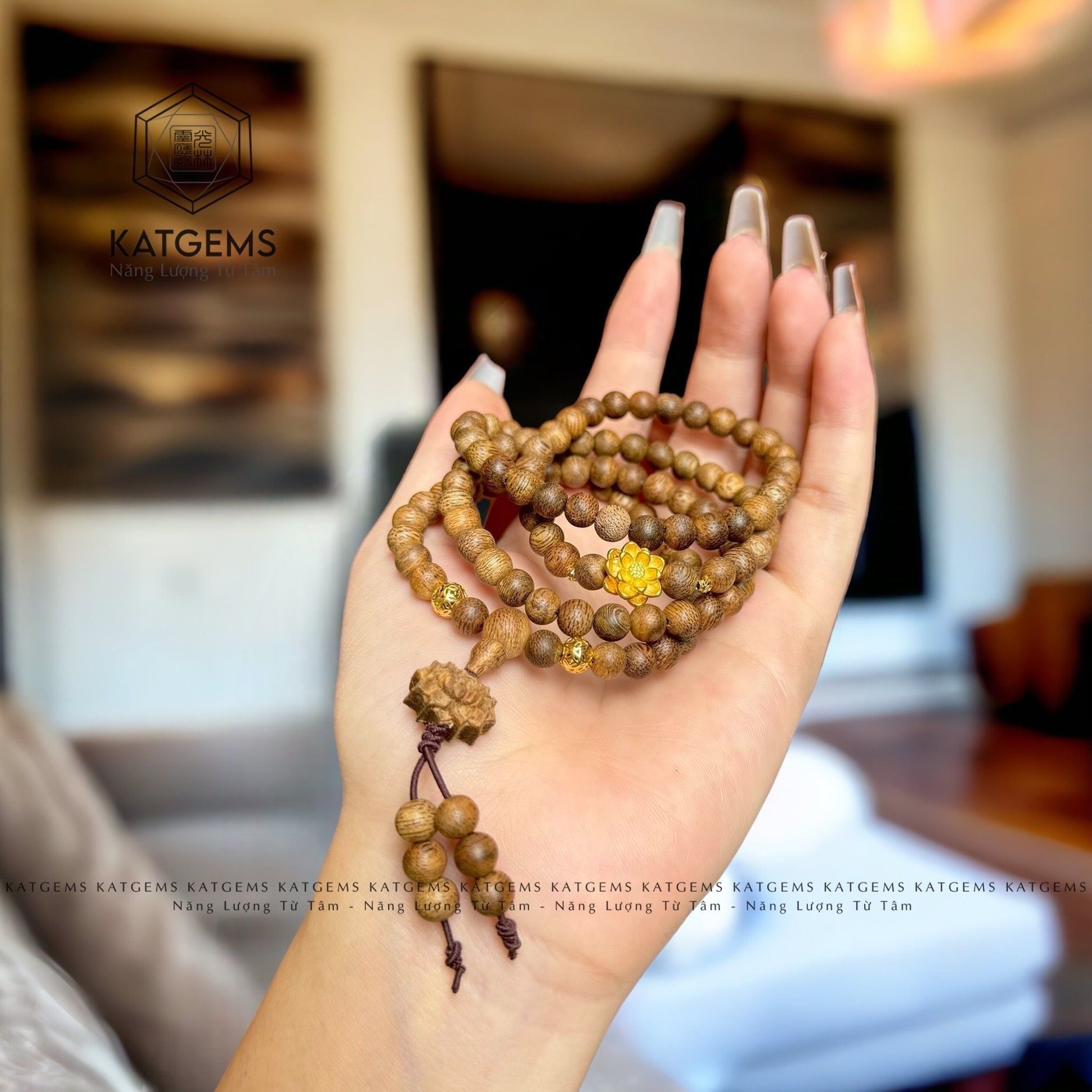 Chuỗi Vòng Trầm Banh Lào 108 Hạt 6Ly Hoa Sen Vàng Trang Sức (Không Kén Mệnh)