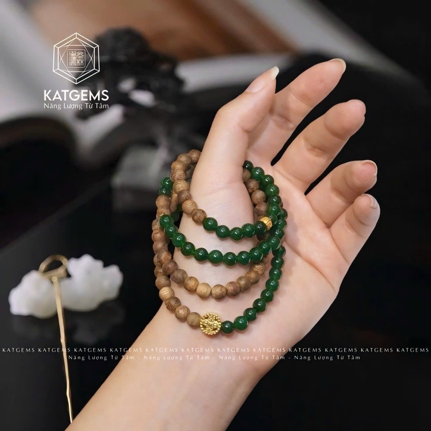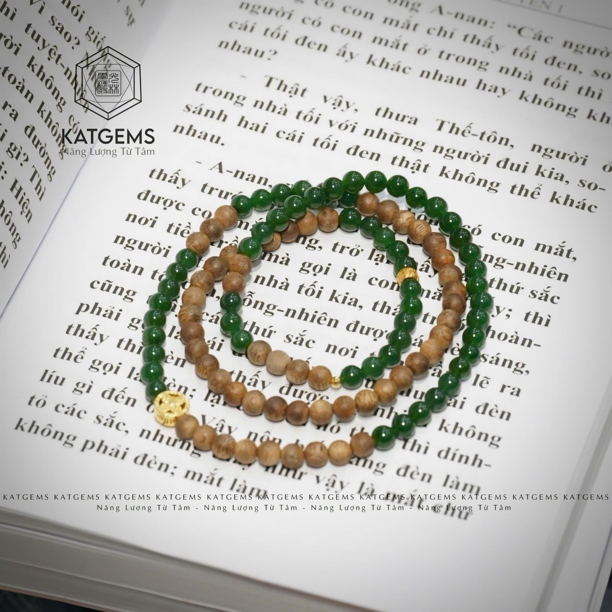 Chuỗi Vòng Trầm Rừng Mix Ngọc Bích 6ly Và Charm Cỏ Bốn Lá (Không Kén Mệnh)