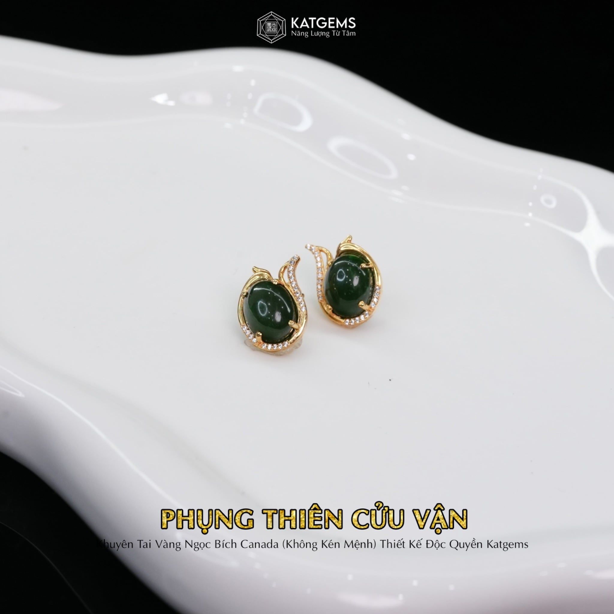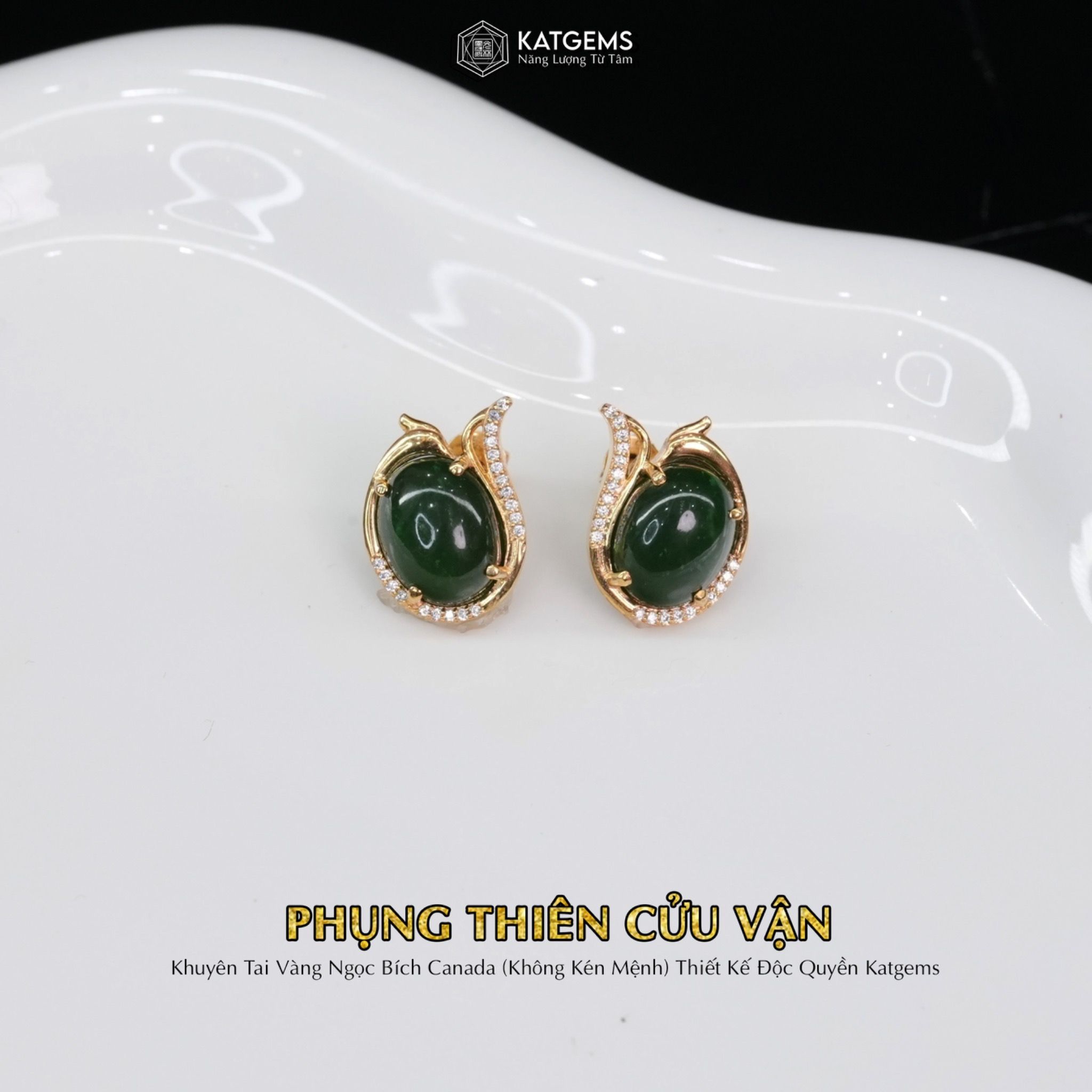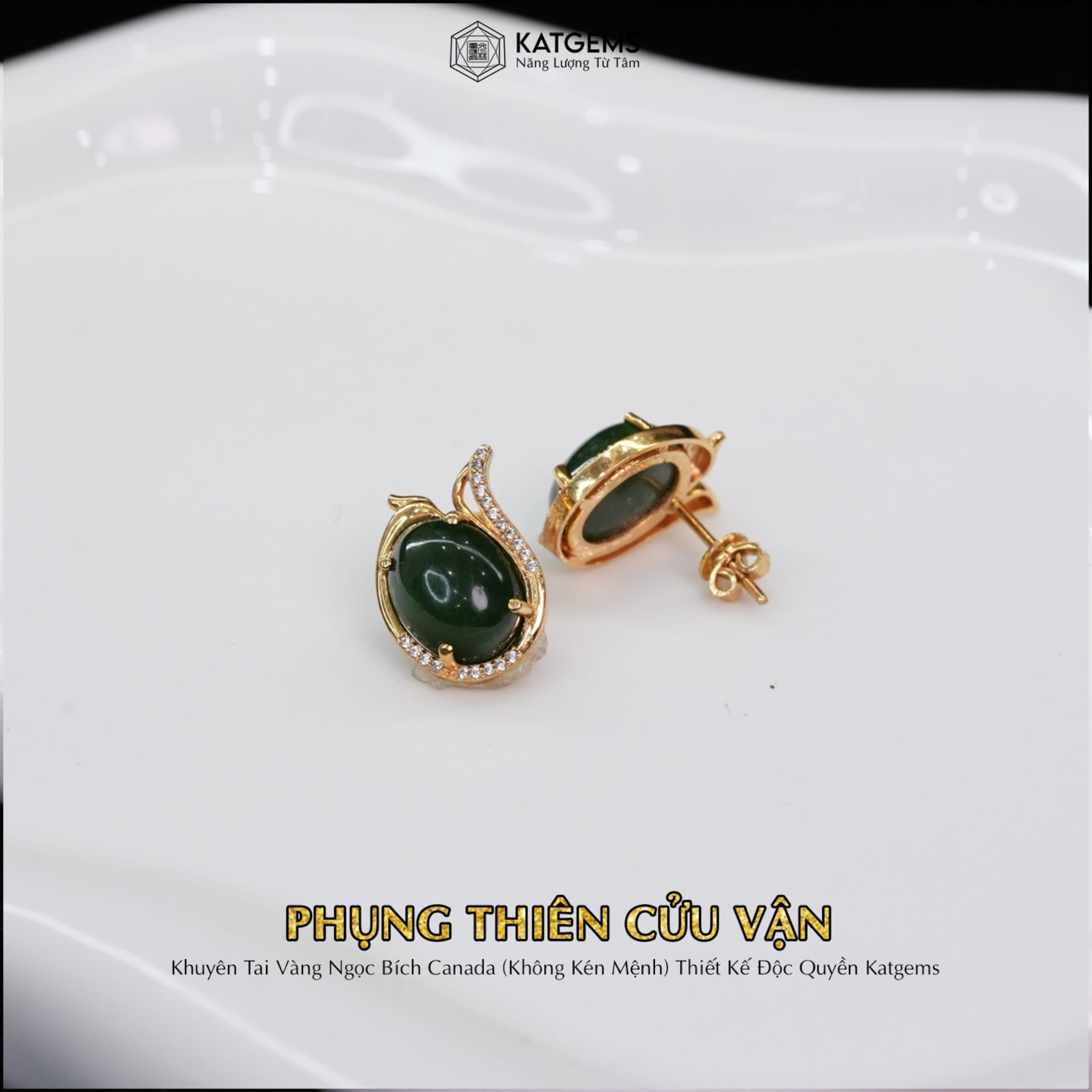 Khuyên Tai Vàng Phụng Thiên Cửu Vận Ngọc Bích Canada KT: 10x8x4li (Không Kén Mệnh) Độc Quyền Katgems