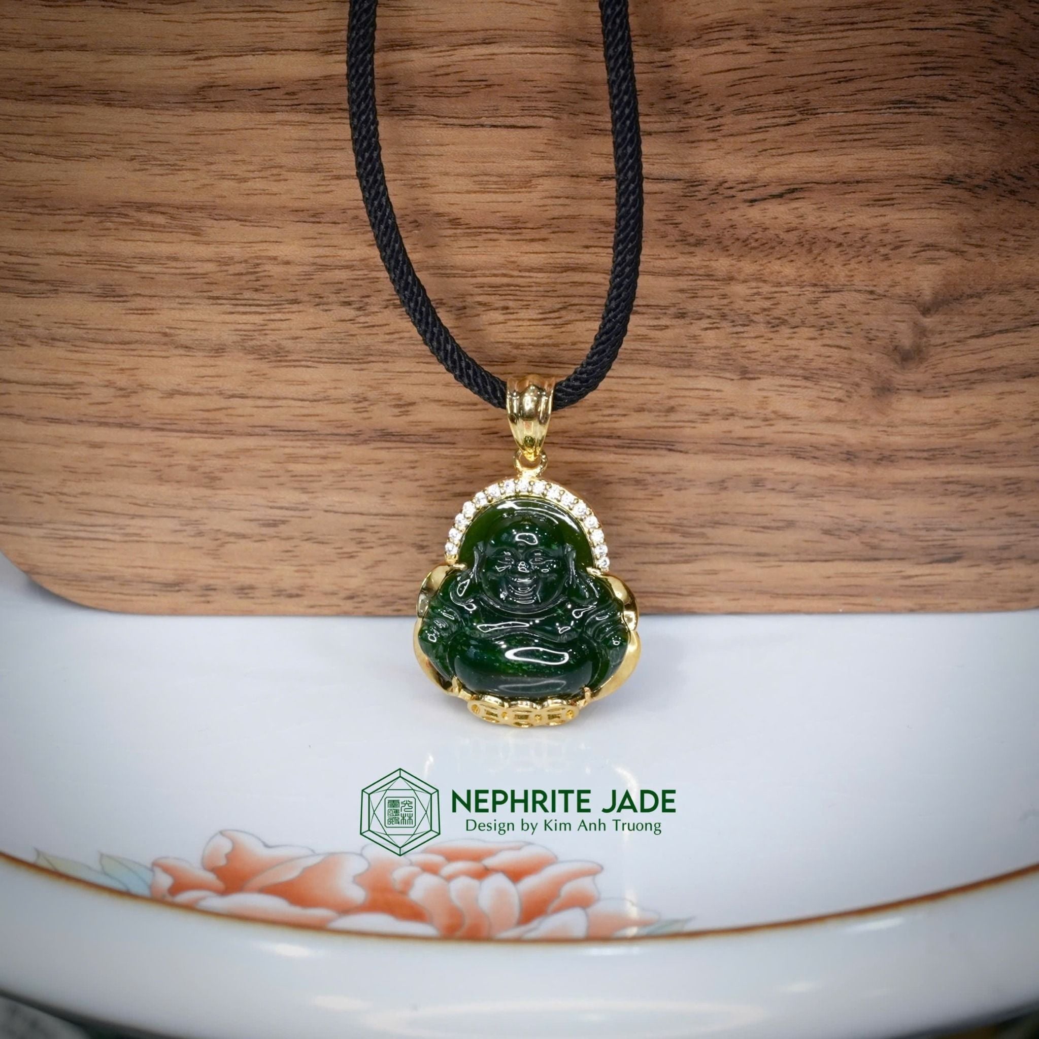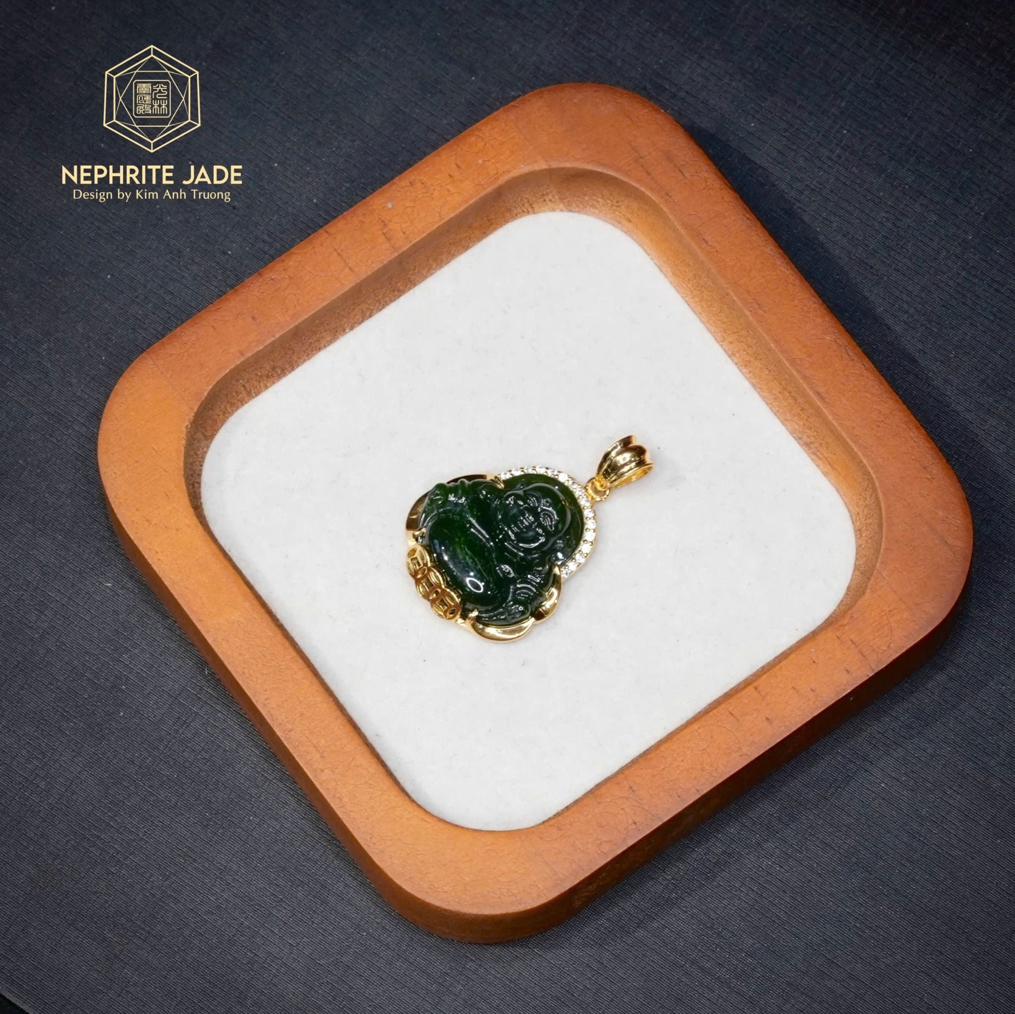 Mặt Phật Di Lặc Ngọc Bích Canada Bọc Vàng Trang Sức Kích Thước 25x28x6mm VIP (Không Kén Mệnh)