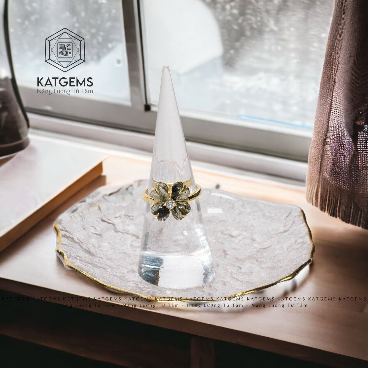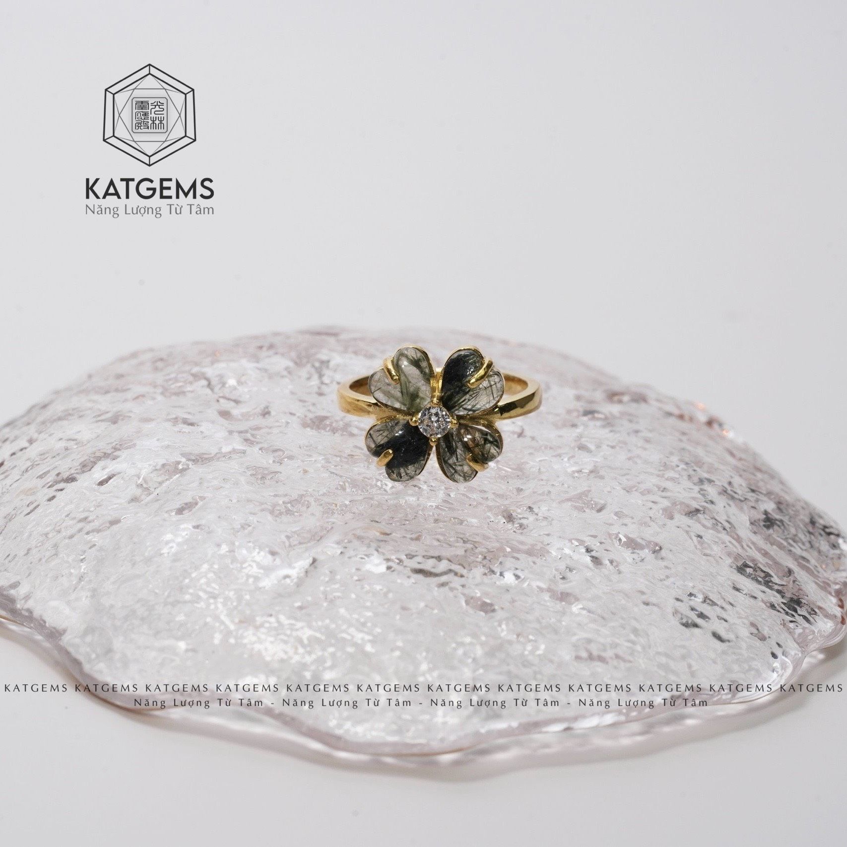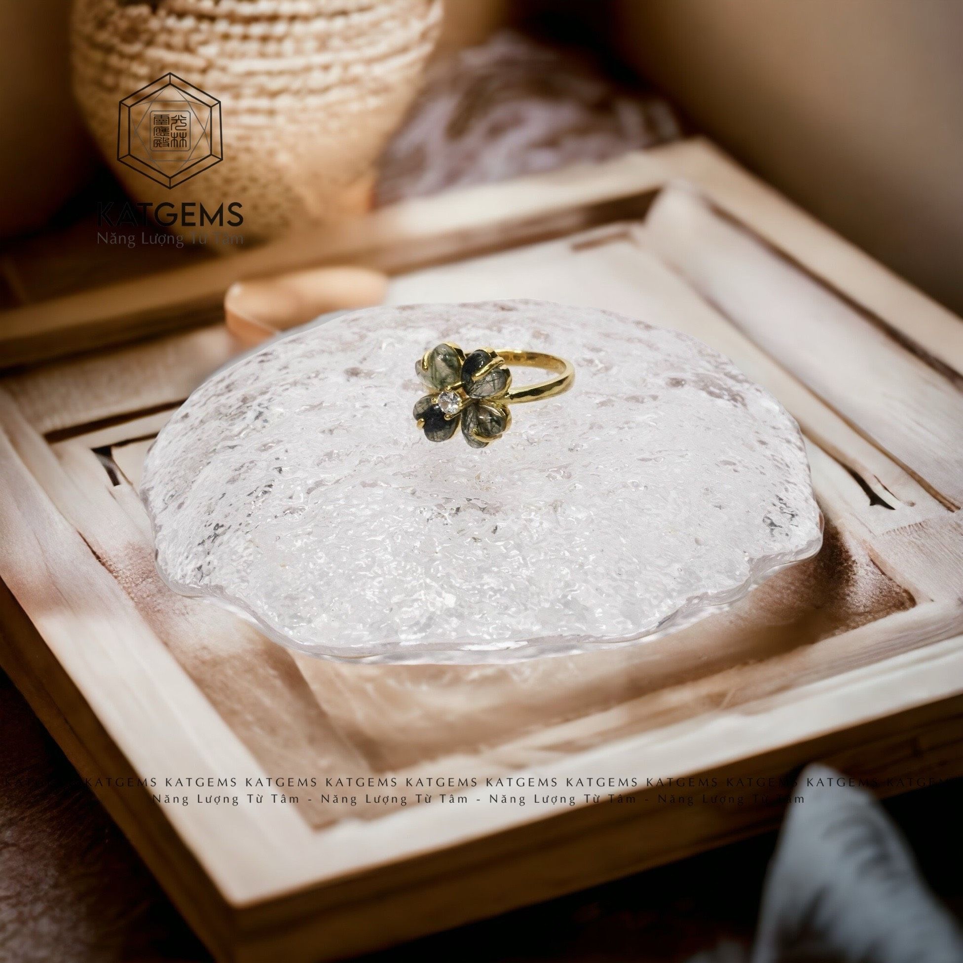 Nhẫn Cỏ Bốn Lá Thạch Anh Tóc Xanh Vàng Trang Sức (Hỏa, Mộc)