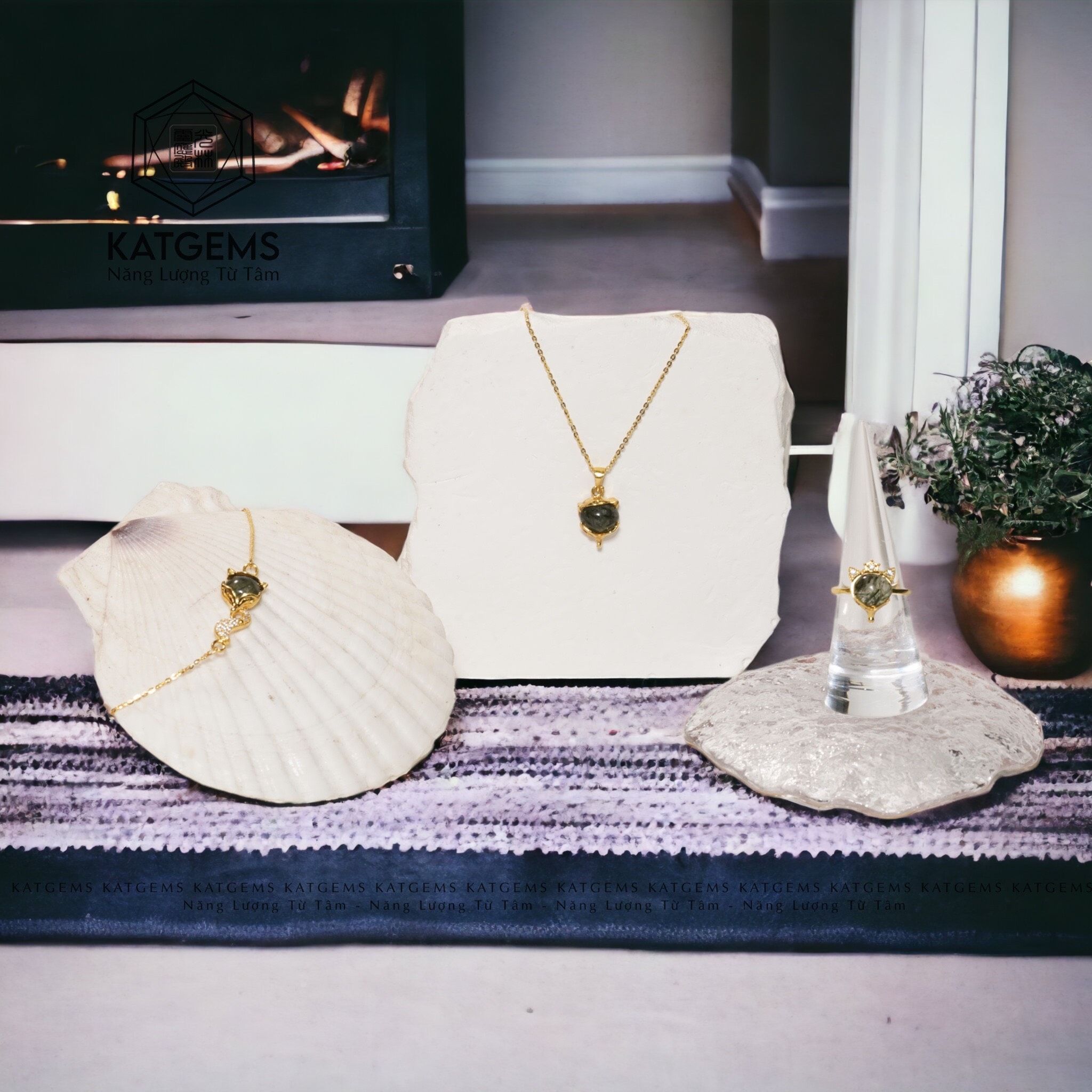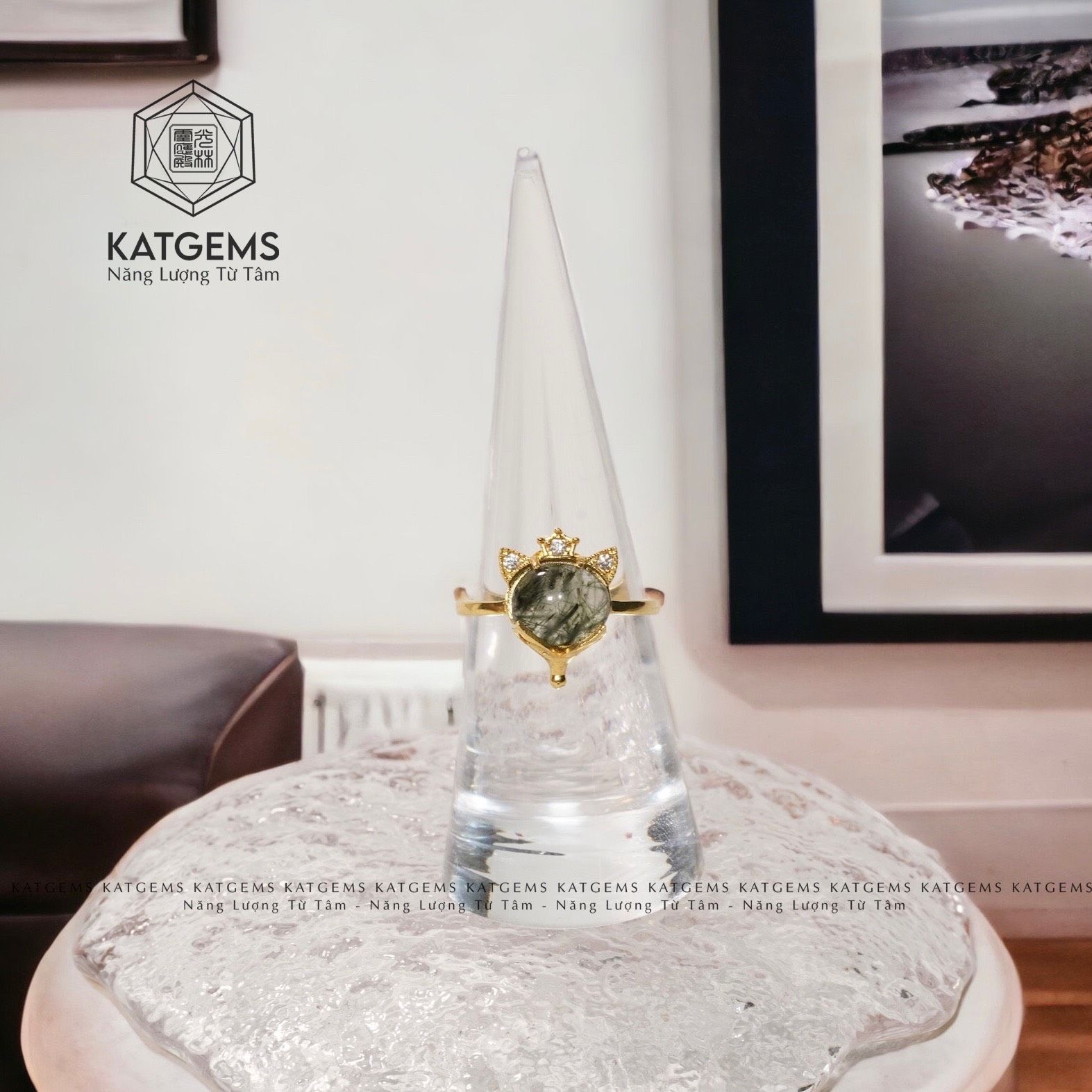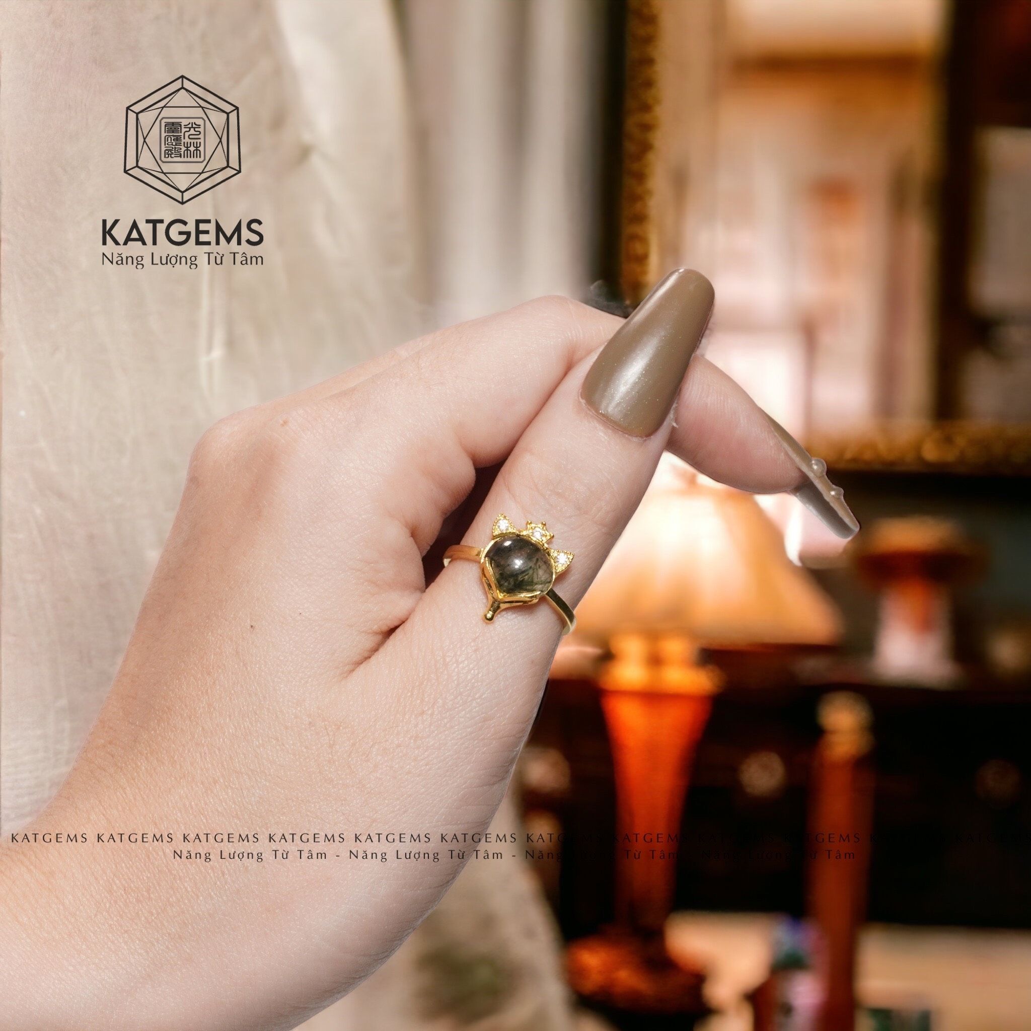 Nhẫn Vàng Trang Sức Bà Hồ Ly Thạch Anh Tóc Xanh (Hoả, Mộc)