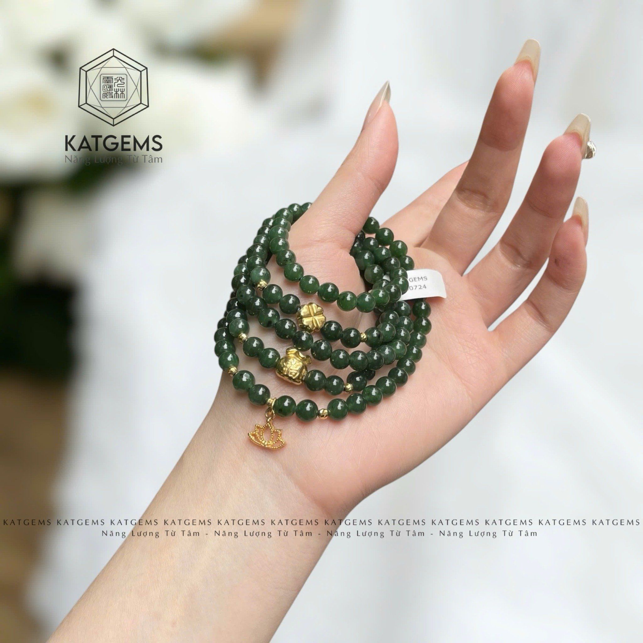 Vòng Chuỗi Ngọc Bích 5.5ly Mix Cỏ 4 Lá, Túi Tiền Và Charm Hoa Sen Vàng Trang Sức (Không Kén Mệnh) 3-128001