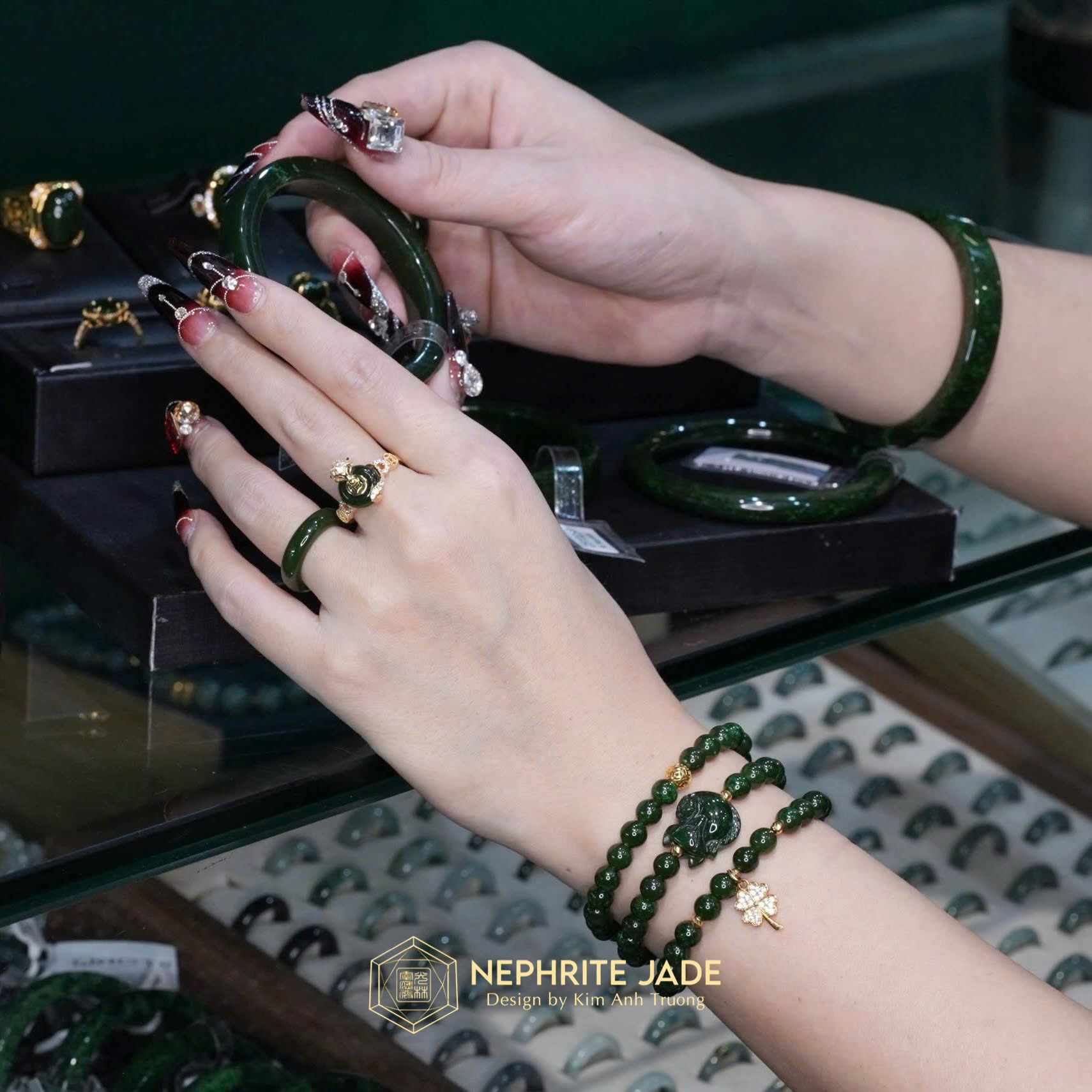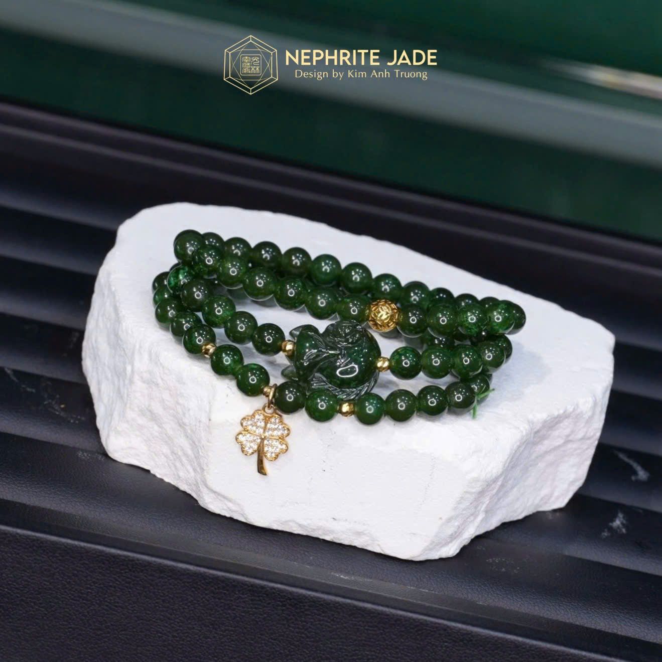 Vòng Chuỗi Ngọc Bích Canada VVIP 6Ly Mix Bà Hồ Ly, Charm Cỏ Bốn Lá Và Bi Kim Tiền Vàng Trang Sức (Không Kén Mệnh)