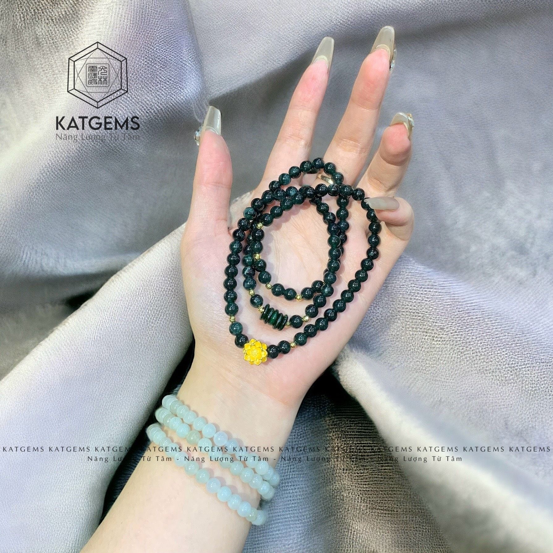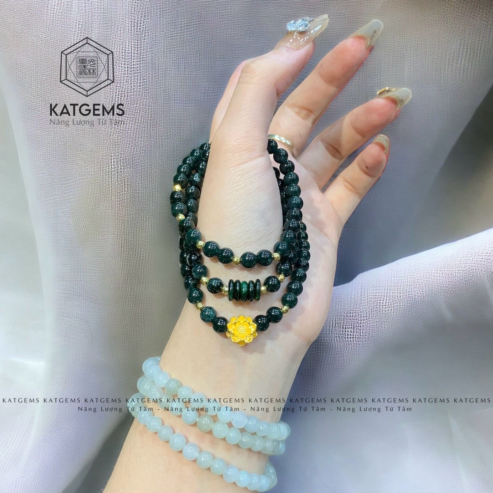 Vòng Chuỗi Ngọc Lục Lam 5.5ly Mix Hoa Sen, Ngũ Điếu Và Bi Vàng Trang Sức (Không Kén Mệnh) 2-126002