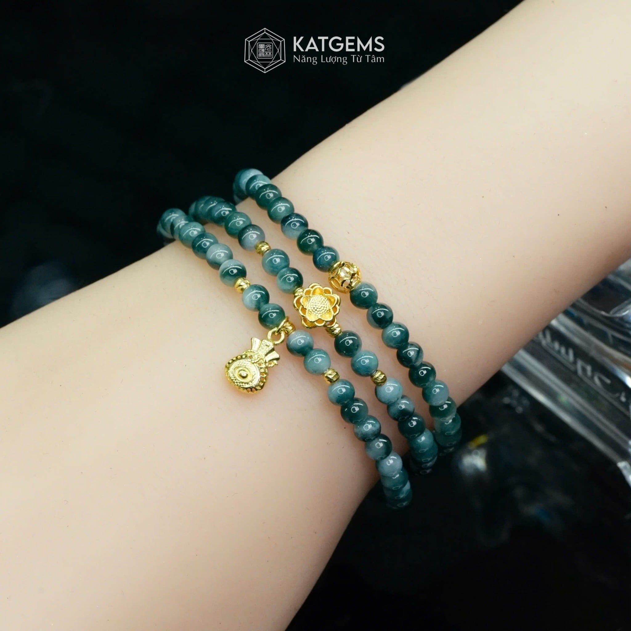 Vòng Chuỗi Ngọc Phỉ Thúy Hoa Bay 4.2ly Mix Bi Kim Tiền, Hoa Sen Vàng Và Túi Tiền Vàng Trang Sức (Không Kén Mệnh) 1-127027