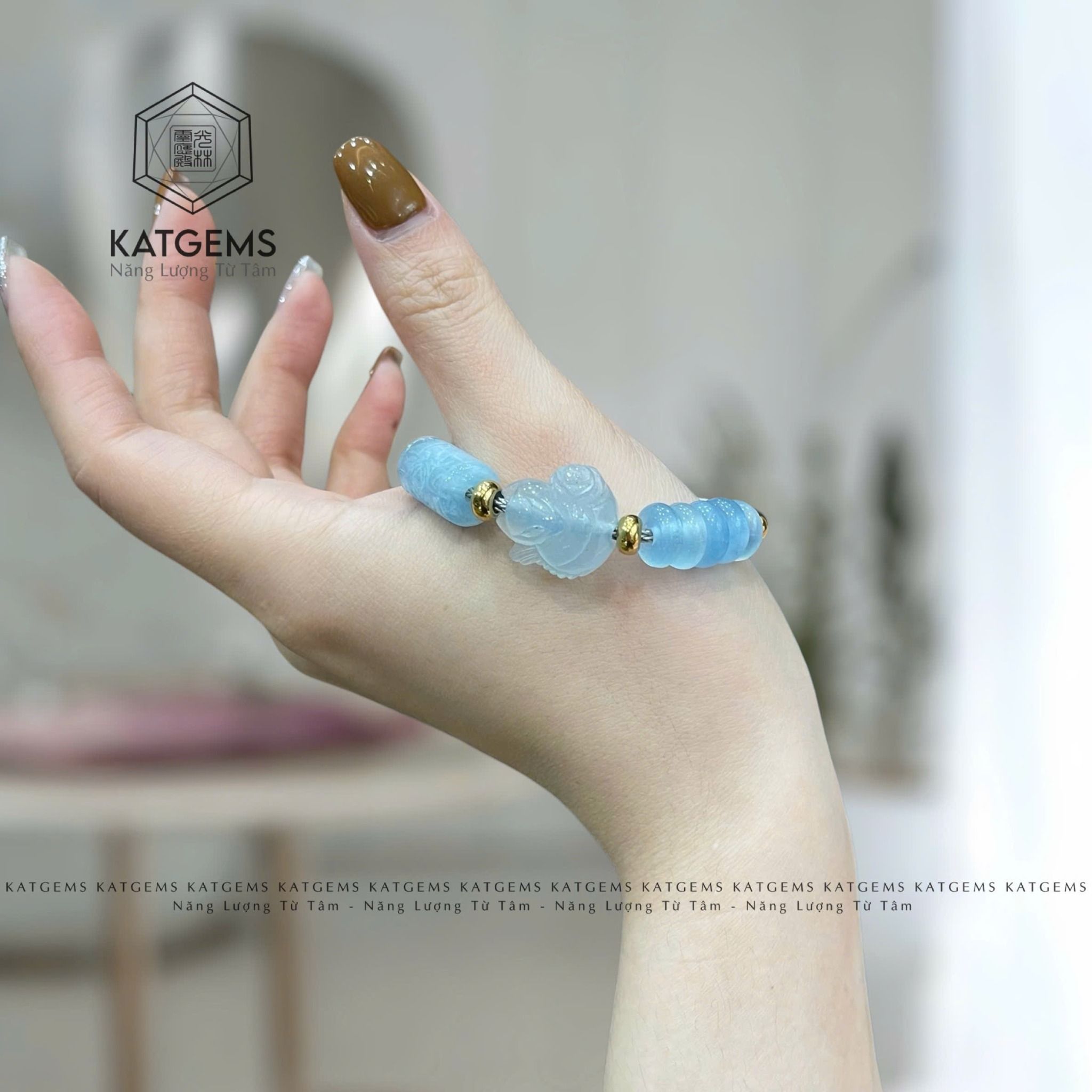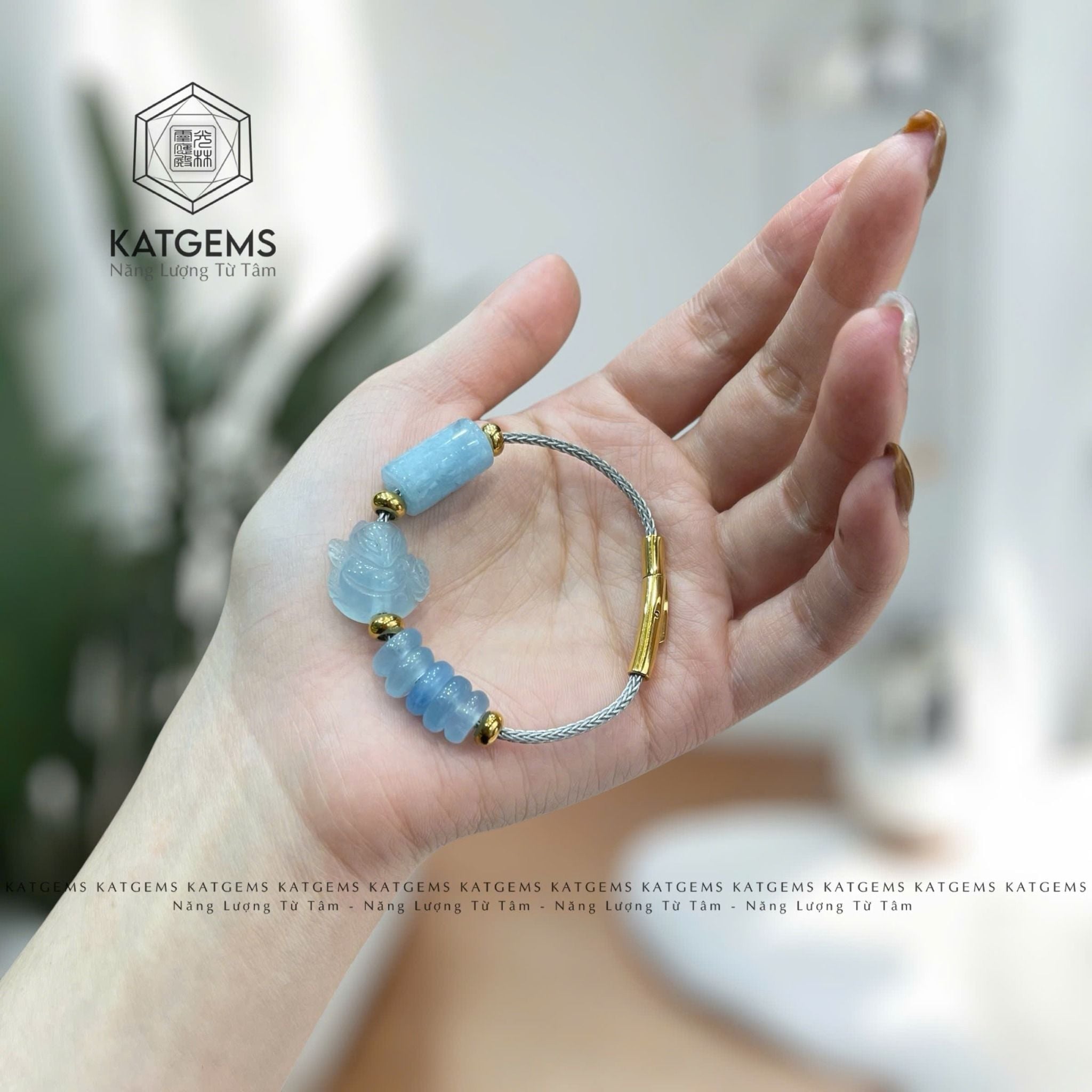 Vòng Dây Cáp Đá Aqua Ngũ Điếu Mix Hồ Ly, Lu Thống Chạm Kim Tiền (Thủy, Mộc)