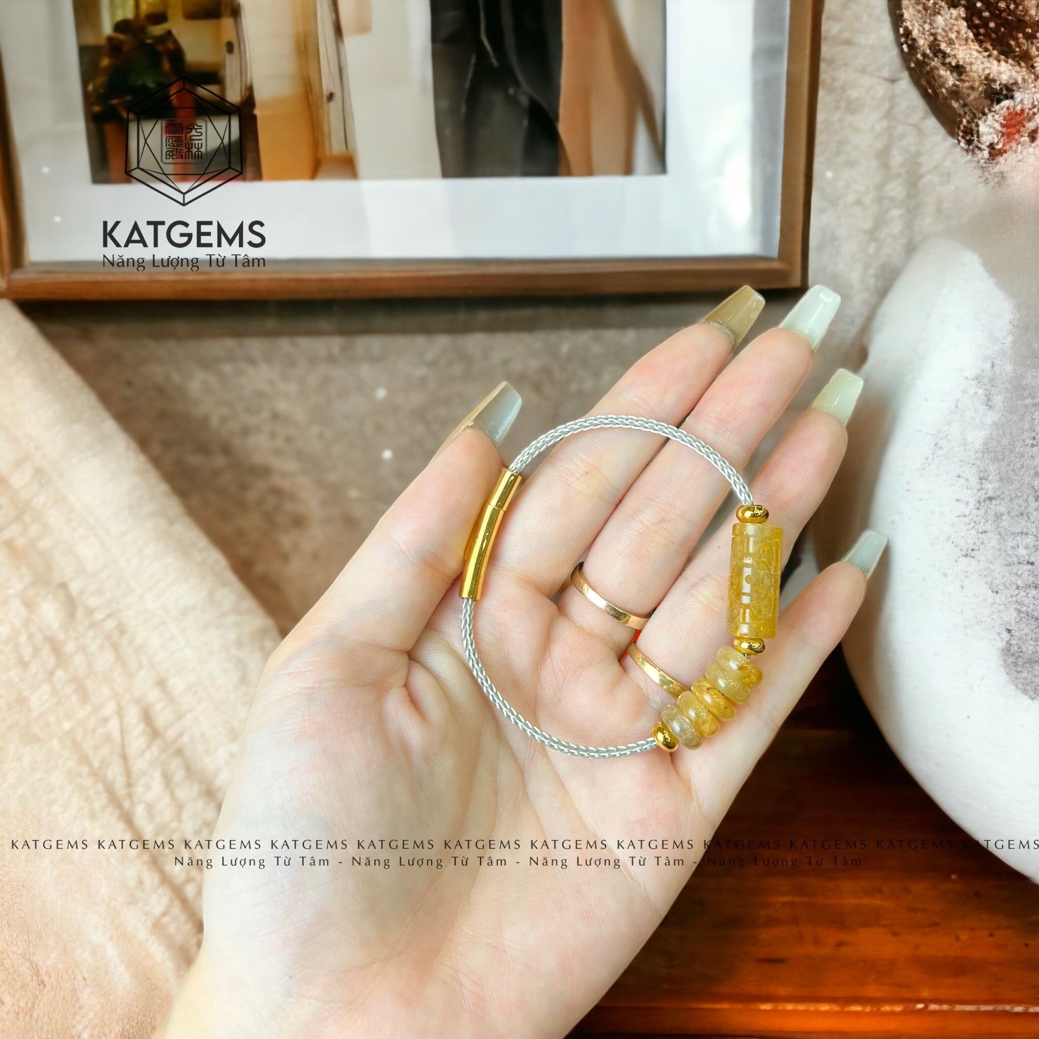 Vòng Dây Cáp Ngũ Điếu Mix Lu Thống Chạm Kim Tiền Đá Thạch Anh Tóc Vàng (Kim, Thổ)