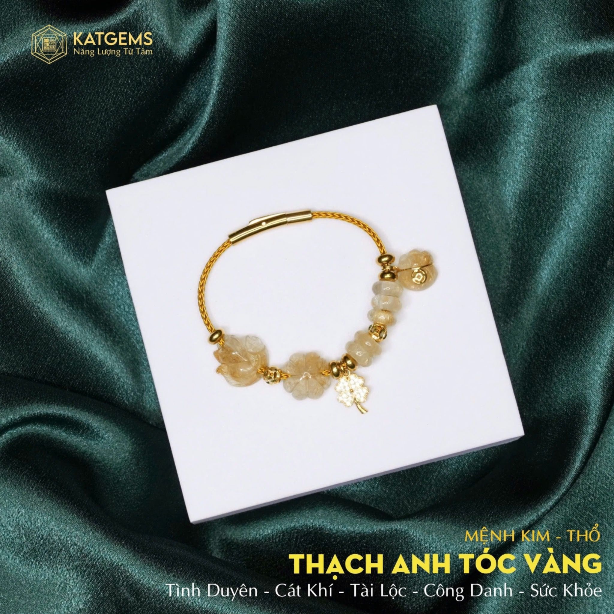 Vòng Dây Cáp Thạch Anh Tóc Vàng Hồ Ly Mix Ngũ Điếu Và Charm Cỏ Bốn Lá, Túi Tài Lộc Và Bi Kim Tiền Vàng Trang Sức (Kim, Thổ) 200525-18
