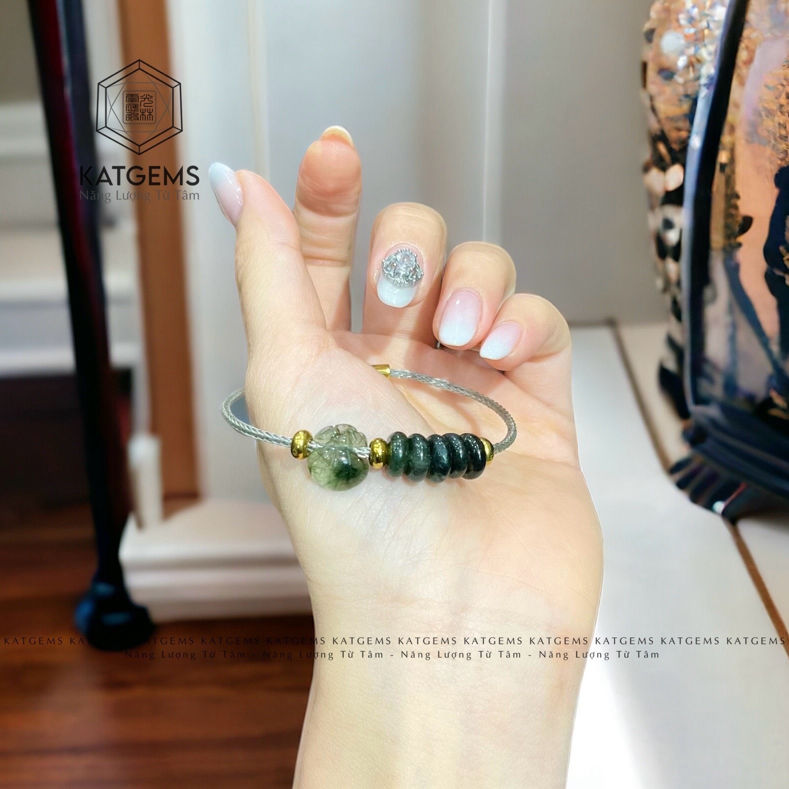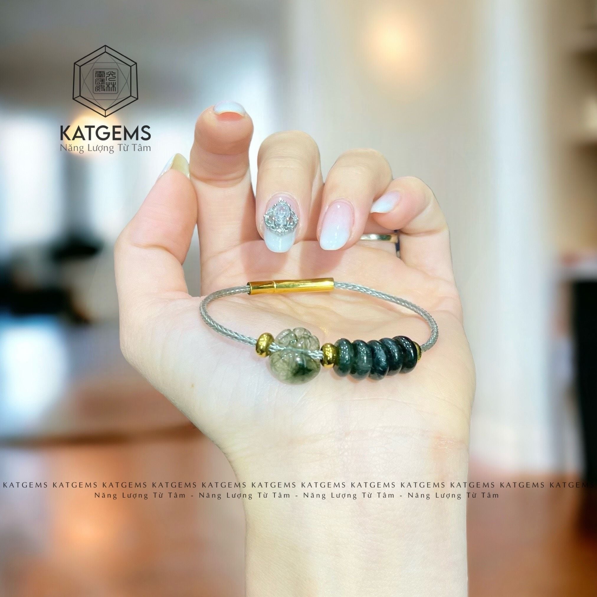 Vòng Dây Cáp Thạch Anh Tóc Xanh Mix Ngũ Điếu Và Túi Tiền Kim Bảo (Hỏa Mộc)