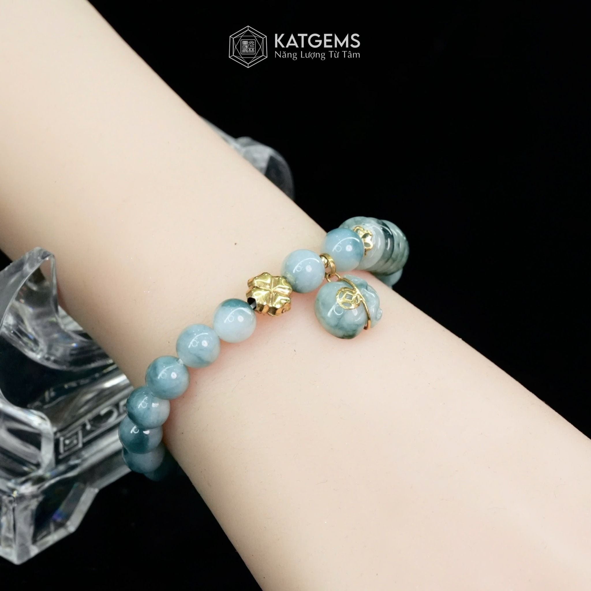 Vòng Đơn Ngọc Phỉ Thúy Hoa Bay 7.8ly Mix Cỏ Bốn Lá, Ngũ Điếu Và Túi Tiền Kim Bảo Vàng Trang Sức (Không Kén Mệnh) 1-200006/3