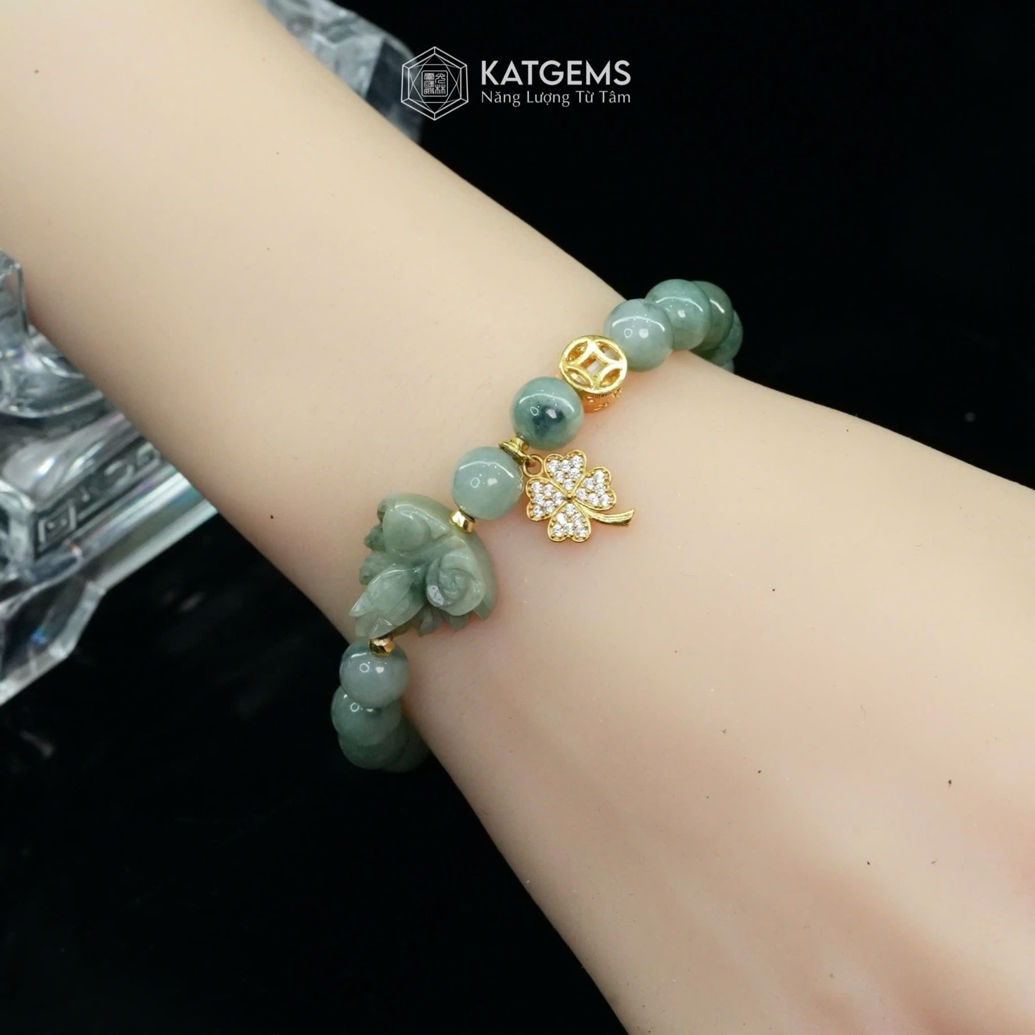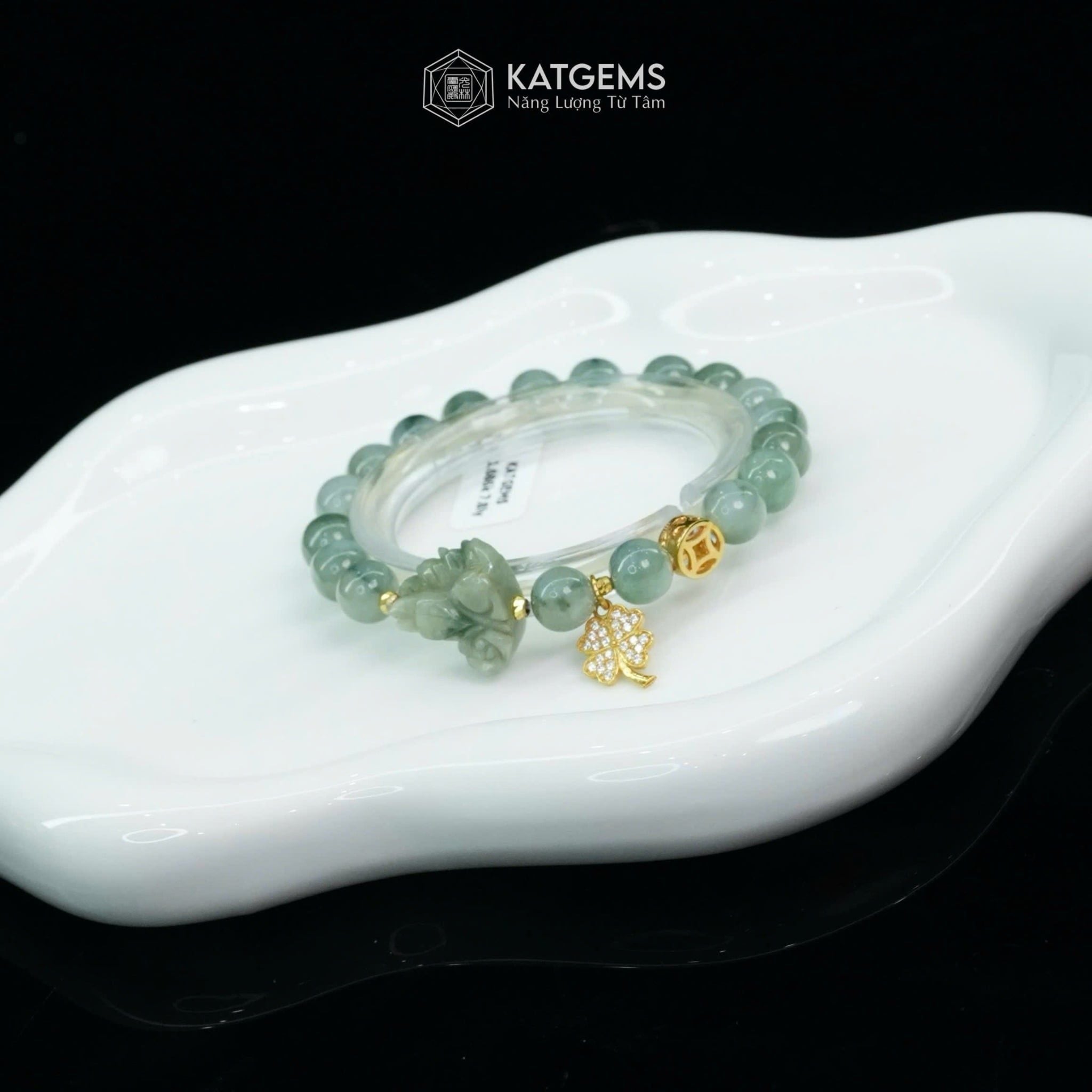 Vòng Đơn Ngọc Phỉ Thúy Hoa Bay 7.8ly Mix Hồ Ly Chúa, Xu Kim Tiền Và Cỏ Bốn Lá Nạm Đá Vàng Trang Sức (Không Kén Mệnh) 2-200008/3